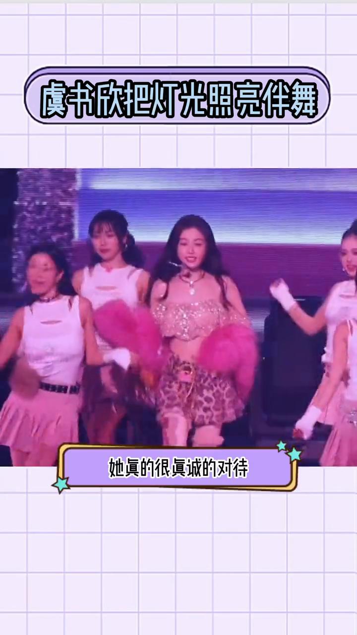 虞书欣把灯光照亮伴舞。 当你把目光放在伴舞身上时,这正是虞书欣想要的。在虞书欣工作室发的幕后花絮里,虞书欣说舞台是她和大家一起完成的,所以这一束追光也应该给到舞台上的所有人。让我慢慢暗下去,突然间把那束光就是给下面的伴舞,全部给他们。她真的很真诚的对待舞台上的每一个人,那束光也真的照亮了好多人。