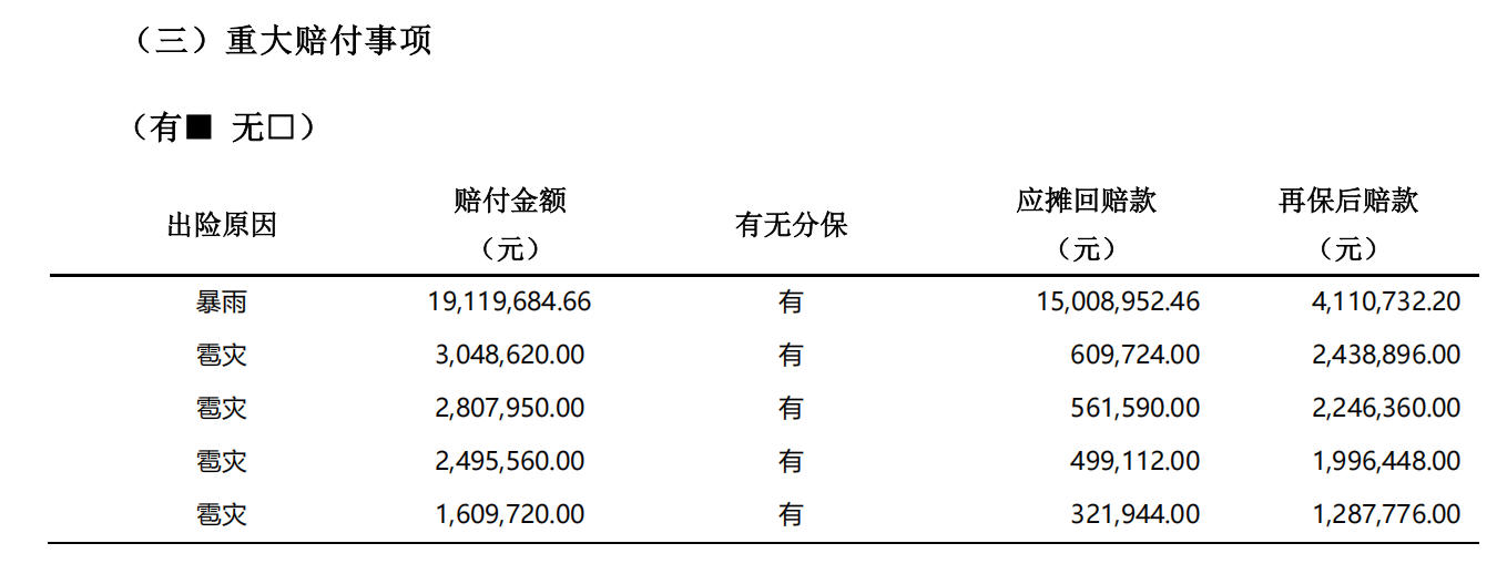 重大赔付事项方面,2025年四季度黄河财险发生多起重大赔付。其中暴雨导致赔付1911.97万元,有分保情况下应摊回赔款1500.90万元,再保后赔款411.07万元;此外,四起雹灾事故分别导致赔付304.86万元、280.80万元、249.56万元、160.97万元,均有分保,再保后赔款分别为243.89万元、224.64万元、199.64万元、128.78万元。