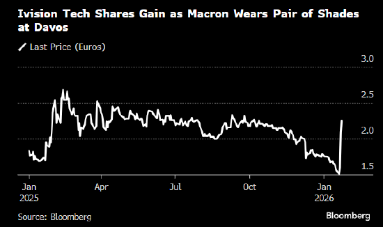 这家总部位于意大利东北部小镇的不知名眼镜制造商,在法国总统亮相前市值仅约1200万欧元(1410万美元)。而这位法国领导人的登场让其眼镜产品成为全球焦点,股价自此飙升,三个交易日内涨幅逾60%,市值攀升至1900万欧元。
