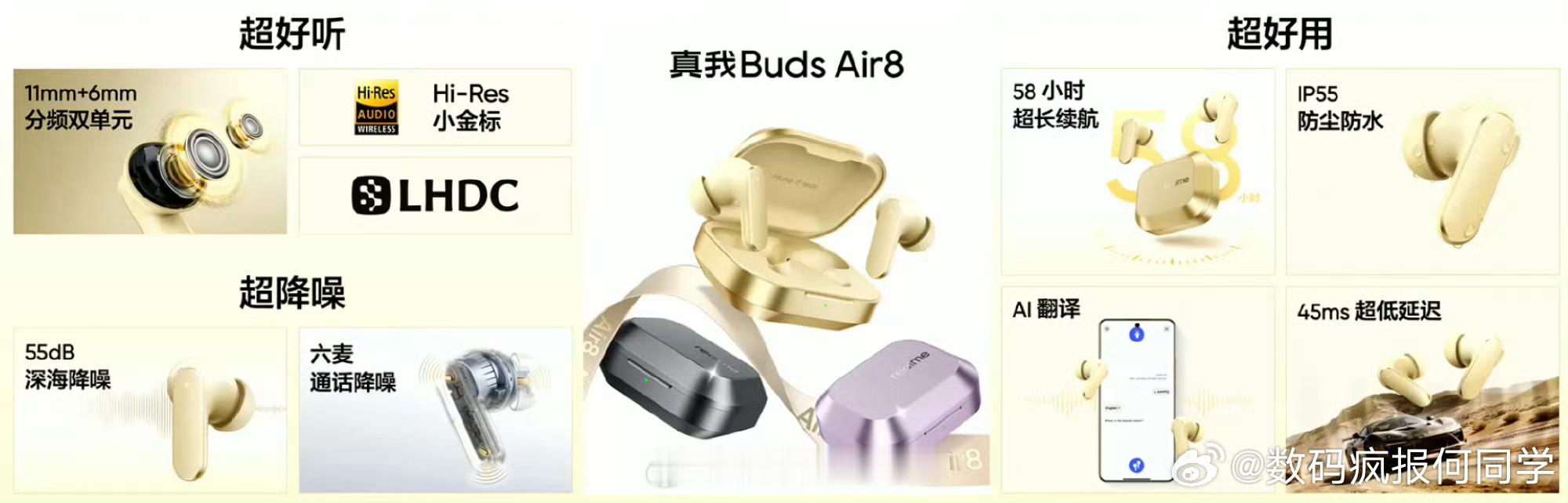 真我 Buds Air 8 发布,首销价 269 元,搭配手机一起购买 239 元。大师金、大师紫、大师灰三款配色,11mm+6mm 分频双单元,55dB 深海降噪,5000Hz 降噪频宽,支持 AI 随身翻译,最长 58 小时续航,IP55 防尘防水,45ms 延迟。