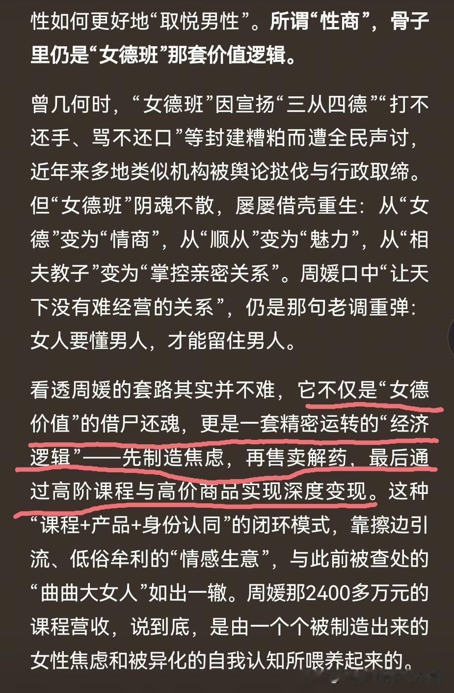 网红周媛的崛起,中国妇女报道忍无可忍,犀利评价此人定义、物化、操控女性,其骨子里仍是“女德班”那套价值逻辑。简言之,就是“女德班”的卷土重来,先给你制造焦虑,再教你怎么做,最后割韭菜,目的不是让女人变得优秀,而是让女人变得迂腐无知,心甘情愿的为自己的无知做作买单。 如今网红周媛被封,大快人心,意料之中。你可以教女性一些知识技能,或者怎么挣钱,怎么处理人际关系,而不是教女人怎么搞定男性,取悦男性,把自己当赚钱工具去使。如果一个男的能因为你一个眼神、一句话而喜欢上你,并不是因为你的魅力大,或者长得美,而是他本来心思就不单纯。你只不过刚好符合他的需求罢了,并不是你有多优秀。 作为新时代女性,最该取悦的难道不是自己吗,为什么非要取悦别人,迎合别人,活成别人那样,我做自己有何不可呢!