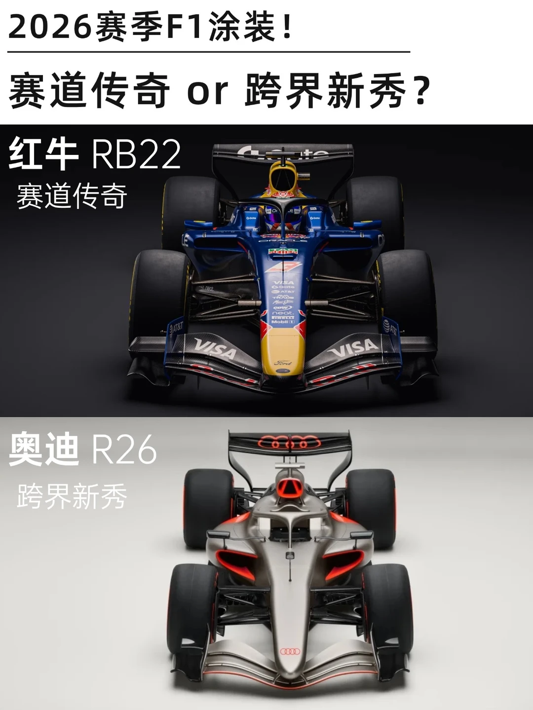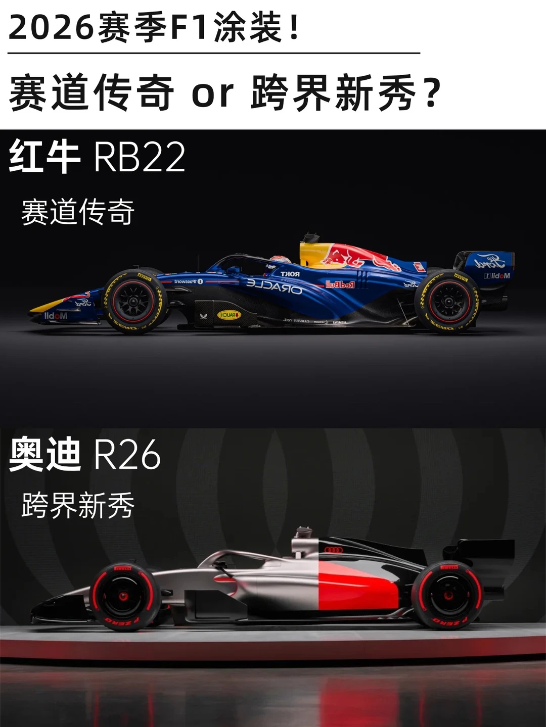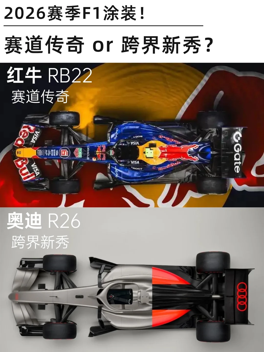 2026赛季奥迪F1新车R26涂装亮相!采用银、黑、红撞色涂装,风格偏向简约利落,外观神似银剑迈凯伦,黑色贴合碳纤维车身材质,红色点缀品牌标识,你觉得这个涂装咋样? 话说回来,一边是老牌劲旅、三连冠的红牛RB22,一边是初来乍到、摩拳擦掌的奥迪R26,你觉得谁的表现会更好?是奥迪顶住压力站稳脚跟,还是红牛延续统治?