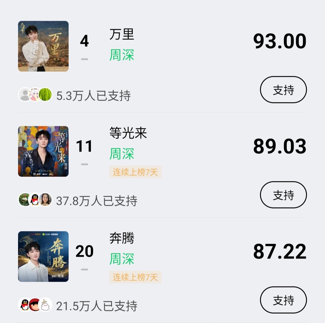 周深 📣 1.24 巅峰潮流 📣米米们晚上好,每歌做6个动作路径:Q音-乐馆-排行-潮流巅峰✅《万里》✅《等光来》✅《奔腾》完成『支持』让更多人听到深深