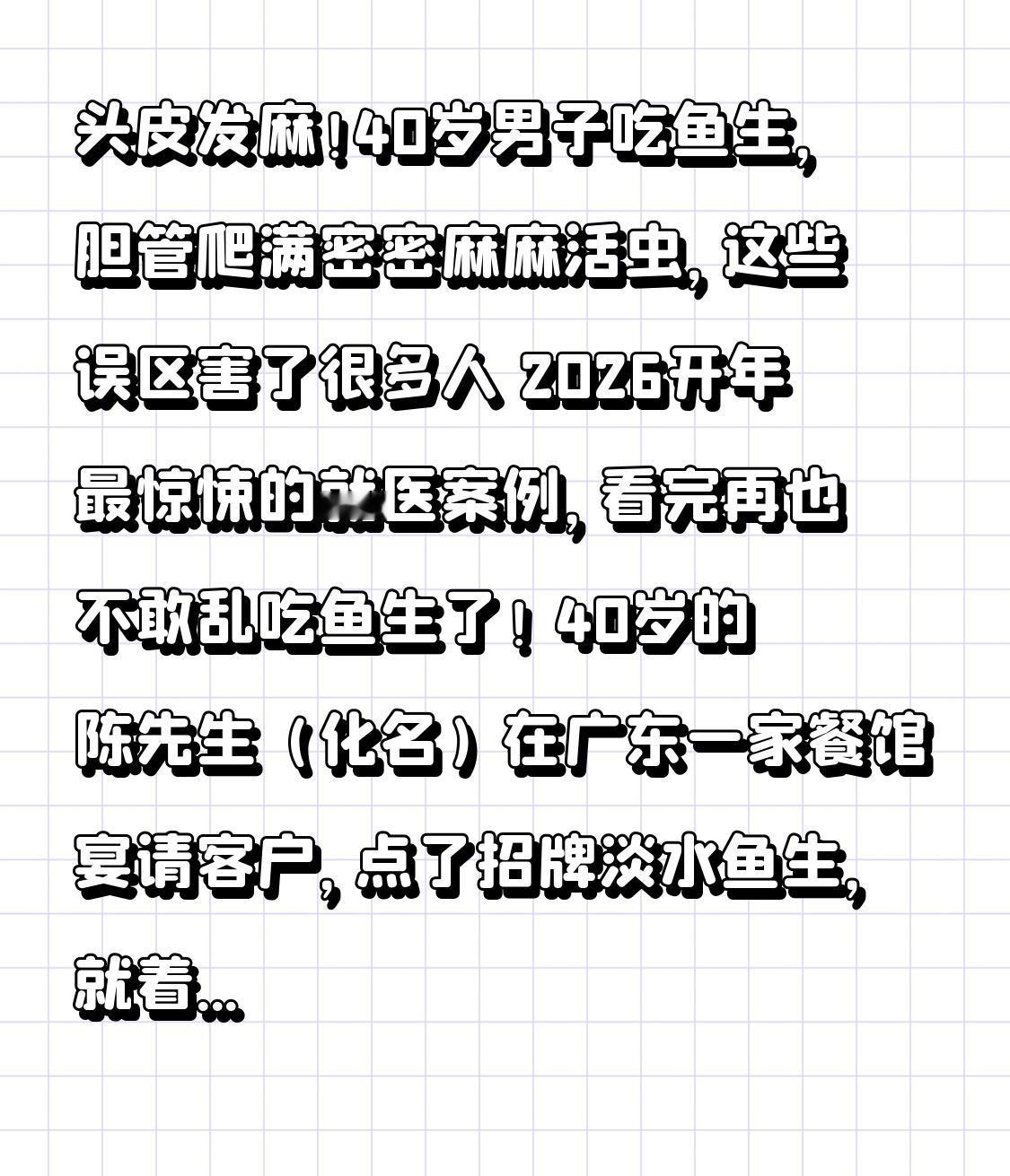 头皮发麻!40岁男子吃鱼生,胆管爬满密密麻麻活虫,这些误区害了很多人 2026开年最惊悚的就医案例,看完再也不敢乱吃鱼生了! 40岁的陈先生(化名)在广东一家餐馆宴请客户,点了招牌淡水鱼生,就着白酒、芥末大快朵颐,觉得“鲜掉眉毛”。可没过多久,他就频繁腹痛、皮肤发黄,体重暴跌10斤,去医院检查后,医生的一句话让他魂飞魄散:“你的胆管里爬满了活虫,再晚来就要肝硬化了!” 手术台上的画面更是让人头皮发麻:医生切开陈先生的胆总管,密密麻麻的肝吸虫顺着胆汁涌出,胆管壁上还附着着一层虫体,最长的竟有2厘米。经统计,他体内足足有300多条肝吸虫,这些虫子已在他肝脏里寄生了8个月,把胆管蛀得千疮百孔,引发了严重的胆管炎和胆结石。 更颠覆认知的转折来了:陈先生一直以为“白酒杀菌、芥末杀虫”,吃鱼生时特意多蘸了调料,可医生的解释让他追悔莫及——肝吸虫的囊蚴耐高温、耐酸碱,白酒、醋、芥末根本杀不死它,哪怕泡24小时也能存活,只有100℃高温持续烹饪5分钟以上,才能彻底消灭。更扎心的是,这不是个例!广医三院曾在一台手术中,从患者胆管里清出上千条肝吸虫,而罪魁祸首都是生吃淡水鱼的习惯。 很多人不知道,肝吸虫是藏在鱼生里的“隐形杀手”,能在人体内寄生20-30年。感染早期可能只是腹胀、乏力,很容易当成肠胃不适,可长期下来,虫体吸食胆管上皮和血液,会导致胆管增厚、结石堆积,最终诱发肝硬化甚至胆管癌。更可怕的是,珠江三角洲等地区的肝吸虫感染率高达20%以上,一次不经意的鱼生聚餐,就可能埋下终身隐患。 还有个致命误区让无数人中招:觉得“海水鱼生更安全”。其实正规刺身级海鱼会经过-20℃冷冻7天杀菌,但很多餐馆为了追求“鲜度”,根本不做冷冻处理,甚至用淡水鱼冒充海水鱼。而家庭自制鱼生更危险,普通冰箱的冷冻温度根本达不到杀虫标准,生熟器具混用还会造成交叉污染。 中国疾控中心早就明确提醒:预防肝吸虫,核心就是管住嘴。不要生吃、半生吃淡水鱼虾,烹饪时一定要彻底煮熟;处理鱼虾的刀具、砧板要和熟食分开,洗完手再接触食物;如果有过生吃经历,出现腹痛、黄疸等症状,要尽快去医院做粪便虫卵或血液检测,吡喹酮等特效药能有效驱虫,但越早治疗效果越好。 陈先生的经历给所有爱吃鱼生的人敲响警钟:所谓的“极致鲜味”,可能藏着致命风险。我们追求美食,本质是为了享受生活,而不是用健康买单。那些让你欲罢不能的鱼生、醉虾,背后可能是肝脏的千疮百孔。 健康从没有捷径,饮食安全的底线绝不能破。愿每个人都能记住:没有什么美味,值得用肝脏去换。你身边有人爱吃生鱼片吗?评论区提醒TA,一起守住饮食安全的防线!