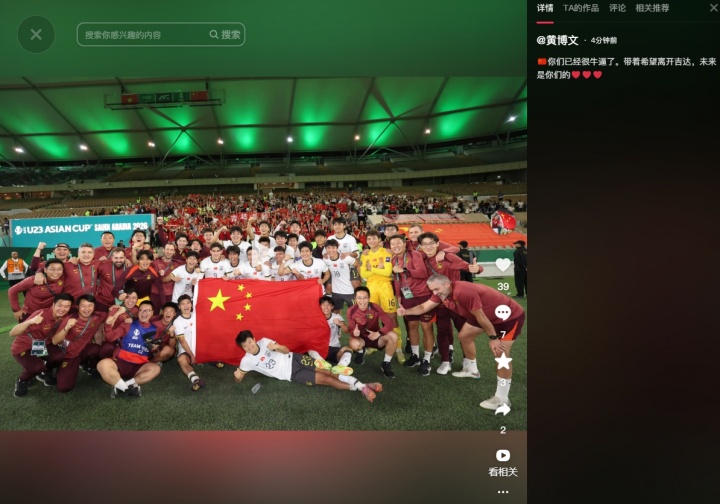 直播吧01月25日讯U23亚洲杯决赛,U23国足0-4不敌日本U23。赛后U23国足助教黄博文发布社媒动态鼓励球员。