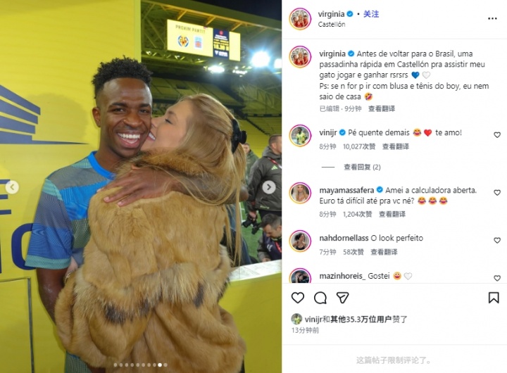 赛后,维尼修斯的女友维吉尼亚在社媒晒出了自己现场观战,并与维尼修斯亲密合影的照片,并配文道:“在回巴西之前,先快速去一趟卡斯特利翁,看我的宝贝踢球并赢球哈哈哈!PS:如果不是为了穿上男朋友的文化衫和球鞋,我甚至不出家门。”