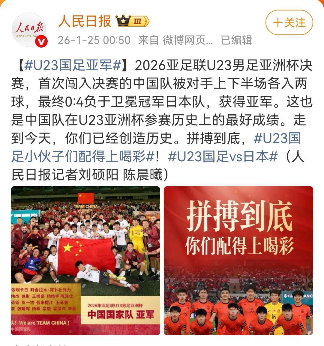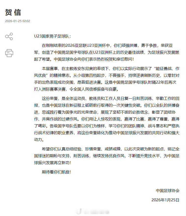 国家体育总局、中国足球协会分别向在U23男足亚洲杯决赛中获得亚军的中国队致贺信。他们不是输掉了决赛才成为亚军,而是一路赢来才站上亚军领奖台。国足男儿们,把头抬起来!虽败犹荣,差距仍在,但请继续加油! 官方鼓励U23国足戒骄戒躁、再接再厉,以本次赛事为新的起点和动力,为中国足球振兴发展再立新功。 第四档球队的我们U23国足打进决赛,本来就已经创造了历史,再说和日本本身就不是一个水平一个档次的,刚开赛的时候U23国足目标是小组出线到如今的亚军,多点宽松和理解,我们已经创造了历史,正视差距,稳步前进,未来是你们的。 所以,球队要多打洲际比赛特别是这类正式比赛,只有与高水平球队比赛才能看到差距、学到东西、锻炼队伍。足球,闭门是造不出来“好车”的。解说说得好,这次进决赛,让中国足球看到了希望,就算真的赢了也不能就说中国足球站起来了,还有很多需要去做。U23亚洲杯亚军这是国家成年队想都不敢想的事!这帮小伙子已经创造了历史! 中国队不是输了一场比赛才成为亚军的,而是赢了很多场比赛成为的亚军!👍很棒的。