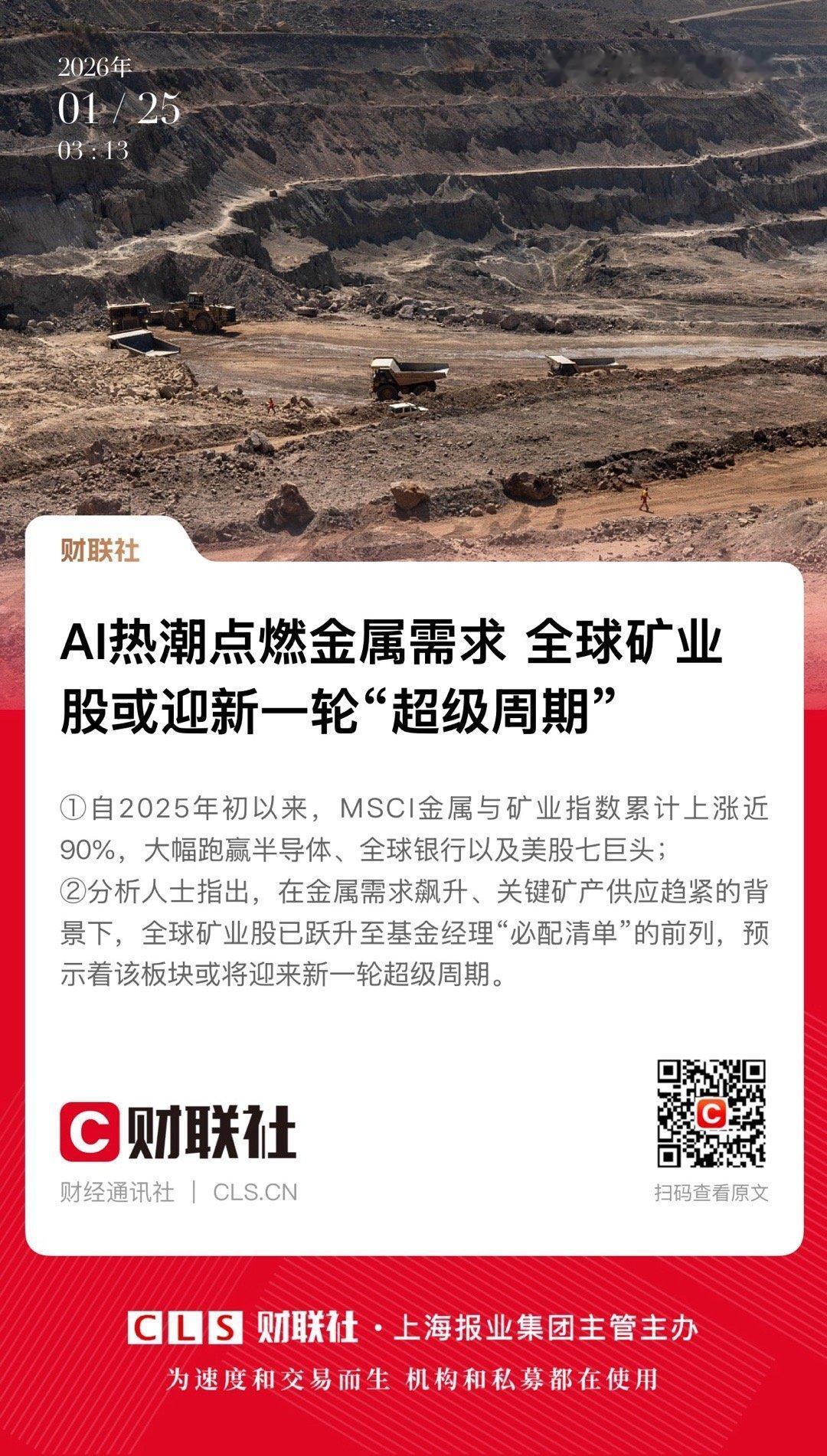 【 AI热潮点燃金属需求 全球矿业股或迎新一轮“超级周期”】 财联社1月25日报道:有分析人士指出,在金属需求飙升、关键矿产供应趋紧的背景下,全球矿业股已跃升至基金经理“必配清单”的前列,预示着该板块或将迎来新一轮超级周期。 自2025年初以来,MSCI金属与矿业指数累计上涨近90%,大幅跑赢半导体、全球银行以及美股七巨头(Magnificent Seven)。而随着机器人、电动汽车以及人工智能(AI)数据中心的快速发展不断将金属价格推向新高,这波行情丝毫没有停歇迹象。 这种强势表现与此前几年形成鲜明反差。此前矿业板块一度不受青睐,受制于大宗商品价格剧烈波动等因素,但如今,曾大量配置科技和金融股的基金经理,似乎重新对矿业板块获得信心。 Pepperstone Group Ltd.研究策略师Dilin Wu表示:“矿业股正悄然从一个乏味的防御型配置,转变为投资组合中的核心支柱——这是少数几个既能受益于货币政策变化,又能应对日益动荡地缘政治环境的板块之一。” 造成这一转变的关键驱动力在于,铜、铝等大宗商品与经济周期的相关性正在下降。它们过去被视为短周期交易品,价格取决于全球经济增速快慢,如今却逐步演变为结构性投资资产。 此外,这些金属也受益于“转型型投资策略”,即投资者通过配置金属资产来间接参与AI主题。 因此,每当疲弱的经济数据打压矿业股时,市场往往迅速出现“逢低买入”的资金。根据美国银行的月度调查,欧洲基金经理目前对矿业板块的净超配比例达到26%,为四年来最高水平,不过仍低于2008年时的38%。 即便如此,矿业板块整体估值依然偏低。 Stoxx 600基础资源指数的远期市净率约为0.47,相对于MSCI全球指数存在明显折价。这一水平不仅比长期均值0.59低约20%,也远低于此前周期高点的0.7 以上。 摩根士丹利分析师、由Alain Gabriel领衔的团队指出:“即便自然资源的战略重要性已显著上升,这一估值差距仍然存在。” Gabriel还指出,矿业公司越来越倾向于“收购而非自建”。当前行业内并购活动频繁,典型案例包括英美资源集团收购泰克资源,以及力拓与嘉能可(Glencore)潜在的合并可能性。 摩根士丹利认为,除了矿业本身资本密集的特性外,这一趋势也反映出矿企追求规模扩张与资产组合优化的意愿,尤其是在铜领域。 Gabriel 补充道,在供应存在缺口的背景下,这种环境有望支撑更高的商品价格和估值倍数。 当然,诸如必和必拓和力拓等大型矿企目前仍然主要依赖铁矿石盈利,而铁矿石目前仍然成承压,这也推动矿企加快向铜领域并购布局。自由港麦克莫兰(Freeport-McMoRan)与Antofagasta是少数专注铜业务的企业。 不过,也有人对涨势过快保持警惕。美国银行已将欧洲矿业板块评级下调至“低配”,理由是经济负面意外风险上升。 新加坡Vantage Point Asset Management首席投资官Nick Ferres表示,他近期已削减黄金敞口。 Ferres说:当任何资产价格出现非线性、甚至抛物线式上涨时,我都会感到担忧,这也是我们目前相对谨慎的原因。但矿业股的估值非常便宜。如果金价维持高位,我们会在回调时重新进场或逐步加仓。” 根据一项市场预测,今年铜仍将供不应求,供应缺口甚至可能比2025年更加严重。 在黄金方面,BI分析师认为金价可能上探每盎司5000美元,而高盛集团则预计到2026年底金价将达到5400美元,较当前水平仍有约8%的上涨空间。 新加坡Reed Capital Partners Ltd.首席投资官Gerald Gan表示:“当前推动大宗商品上涨的力量更强、也更加多元。未来几个月,我们计划逐步提高投资组合中对矿业股的配置比例。” 网页链接 网页链接