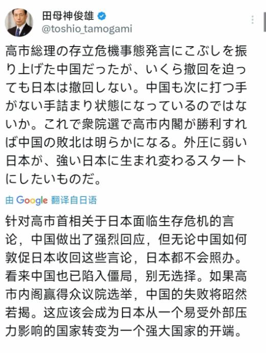 日本高官表示,日本已然让中国陷入了僵局。1月22日,日本前航空自卫队幕僚长田母神俊雄发文叫嚣称,无论中方如何抗议,日本都不会收回高市早苗的涉台错误言论,这让中国“陷入了僵局”。 说白了,田母神俊雄言论纯属信口雌黄,可能是为了稳住日本国内民众的情绪,为右翼势力代表高市早苗稳固政治根基。 要知道,中国对日本的一系列精准反制,本就保持着克制与理性,对中国的影响可谓是谨小慎微,而真正被拖入困境的,从来都是日本自己。例如中国的稀土出口管控,对中国而言,最多也就是损失日本一个国家的出口,而日本却要面临稀土供应链彻底断裂的致命危机。 要清楚,稀土是高精度工业的刚需,日本一旦失去稀土的稳定供应,就可能会面临产业停摆,工人失业风险。而之前仅仅只是水产品限购,旅游业打击就已经让日本民众在高市官府门口公然闹事,如若让日本面对这么大的危机,日本国内可能会迎来更深层的冲击,高市的支持率也势必会有所下降。 说实话,田母神俊雄这番发言,虽然现在能暂时稳住日本的心态,但时间线拉长,自然会让日本民众感受出端倪,届时,其这番胡说八道的言论也就会不攻自破,沦为国际的笑柄。 说到底,日本最好的做法依然是正视历史,放弃“军国主义”复苏的企图,向中国真诚道歉。如若日本一再在错误的道路上执迷不悟,最终只会为自己的挑衅行径付出惨痛代价,落得自食恶果的结局。