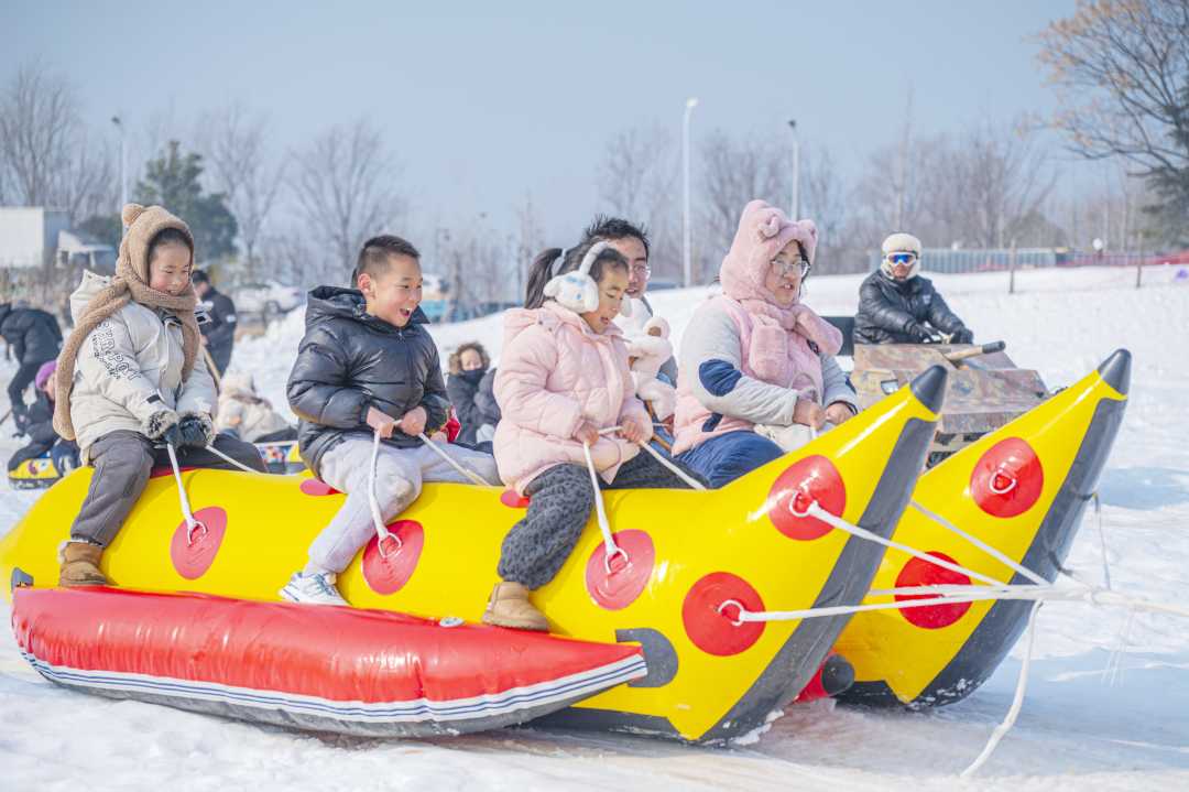 1月25日,江苏省宿迁市湖滨新区骆马湖上相湾大雪场,游客正在体验冰雪项目。
