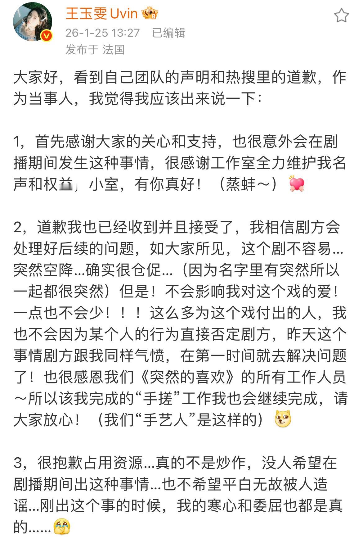 王玉雯否认炒作王玉雯说寒心和委屈都是真的 1月25日,发文回应道歉,表示道歉已经收到并且接受了,相信剧方会处理好后续的问题。并否认此事是炒作,寒心和委屈也都是真的。