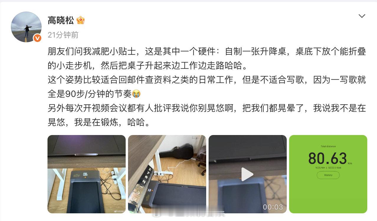 高晓松为减肥自制升降桌跑步机高晓松分享减肥技巧 高晓松分享减肥巧思,自制升降桌搭配桌下走步机,边办公查资料边走路燃脂,还调侃写歌节奏都跟着步速走,90步/分钟拿捏~开视频会议被吐槽晃悠,委屈解释 “我是在锻炼” 笑不活了