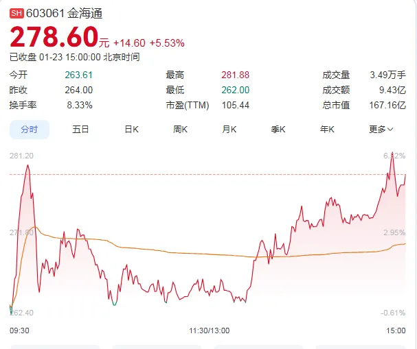 1月23日,金海通强势上涨5.53%,收盘价为278.60元,成交额为9.43亿元,总市值攀升至167.16亿元。据统计,自2025年12月31日以来的16个交易日内,金海通股价累计涨幅超过100%,表现非常亮眼。