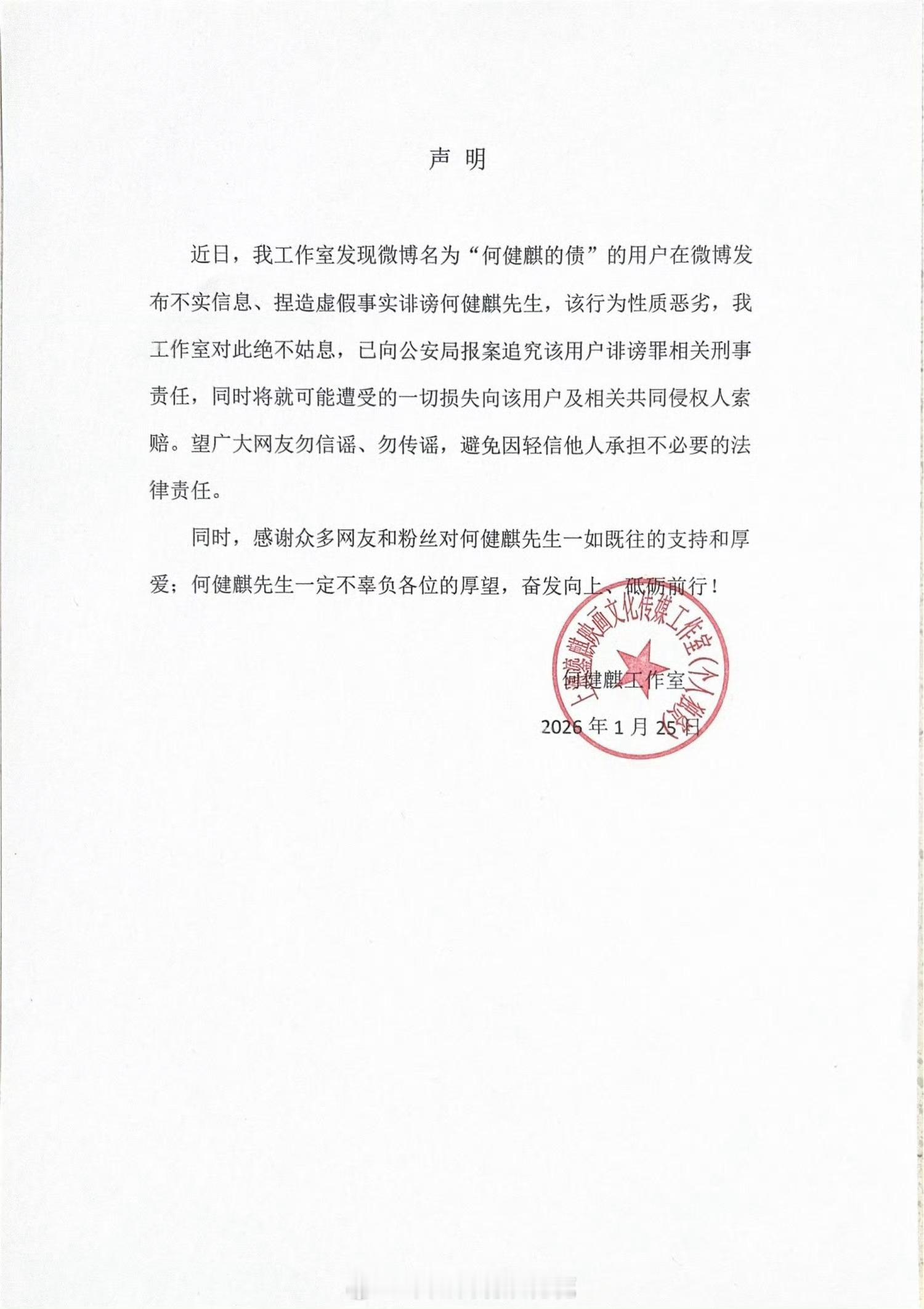 何健麒工作室回应了被实名举报涉d何健麒工作室发严正声明何健麒工作室称已报案