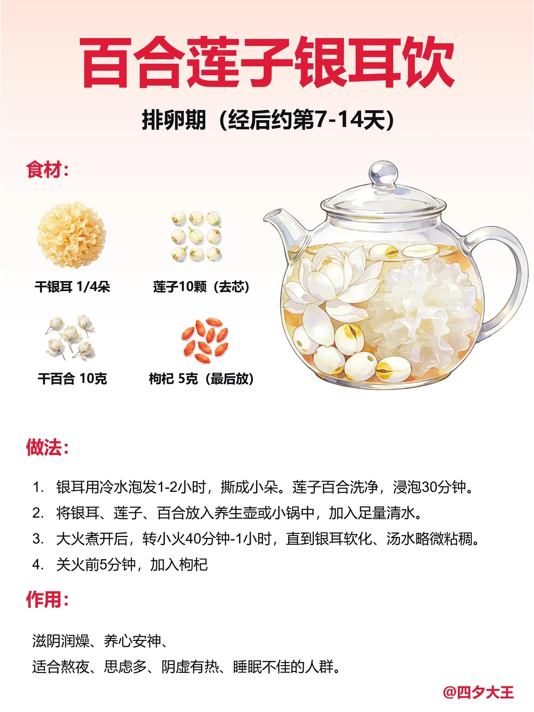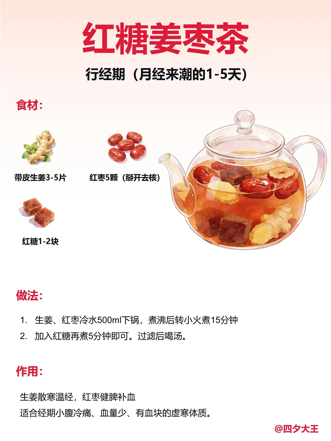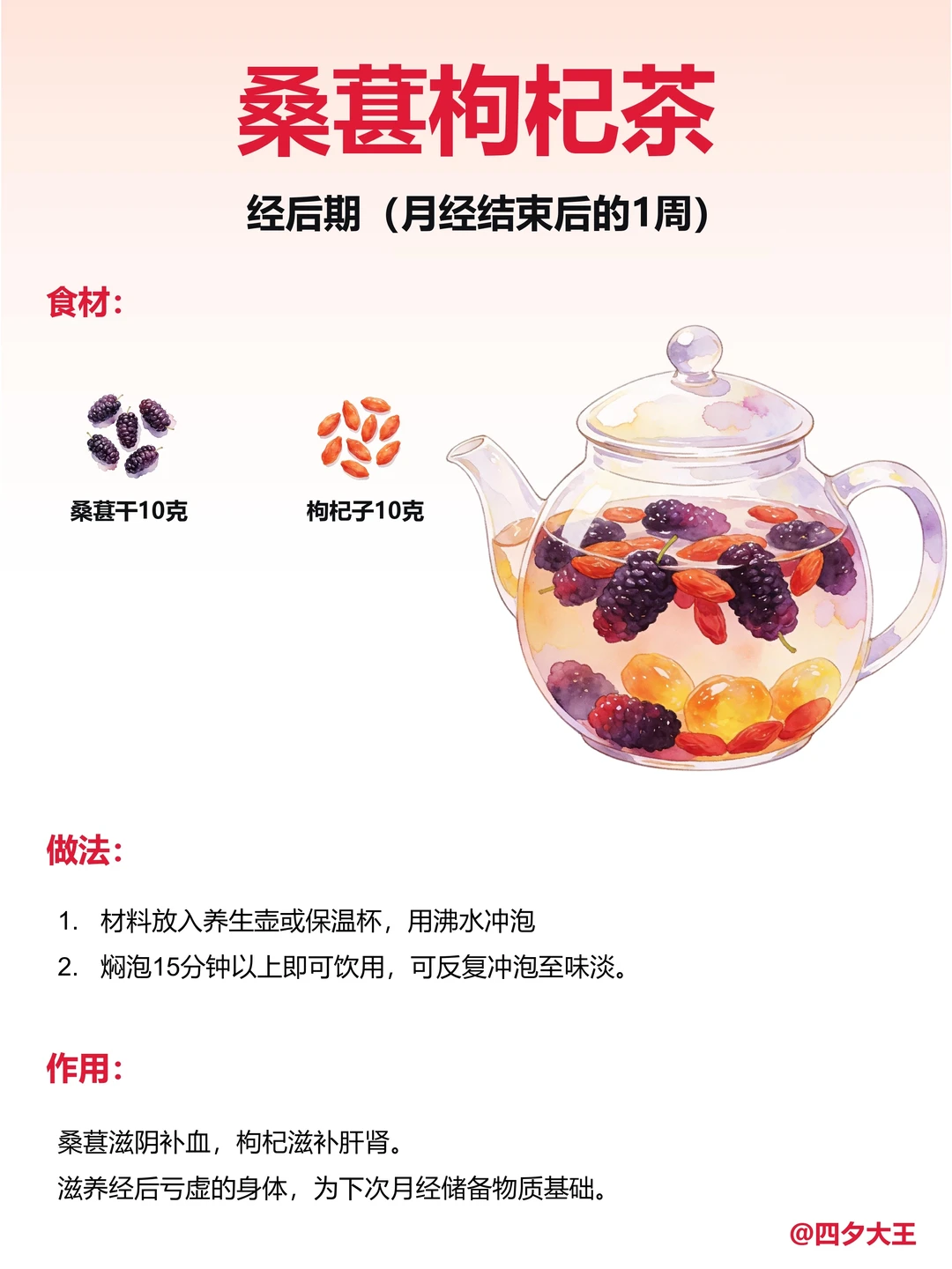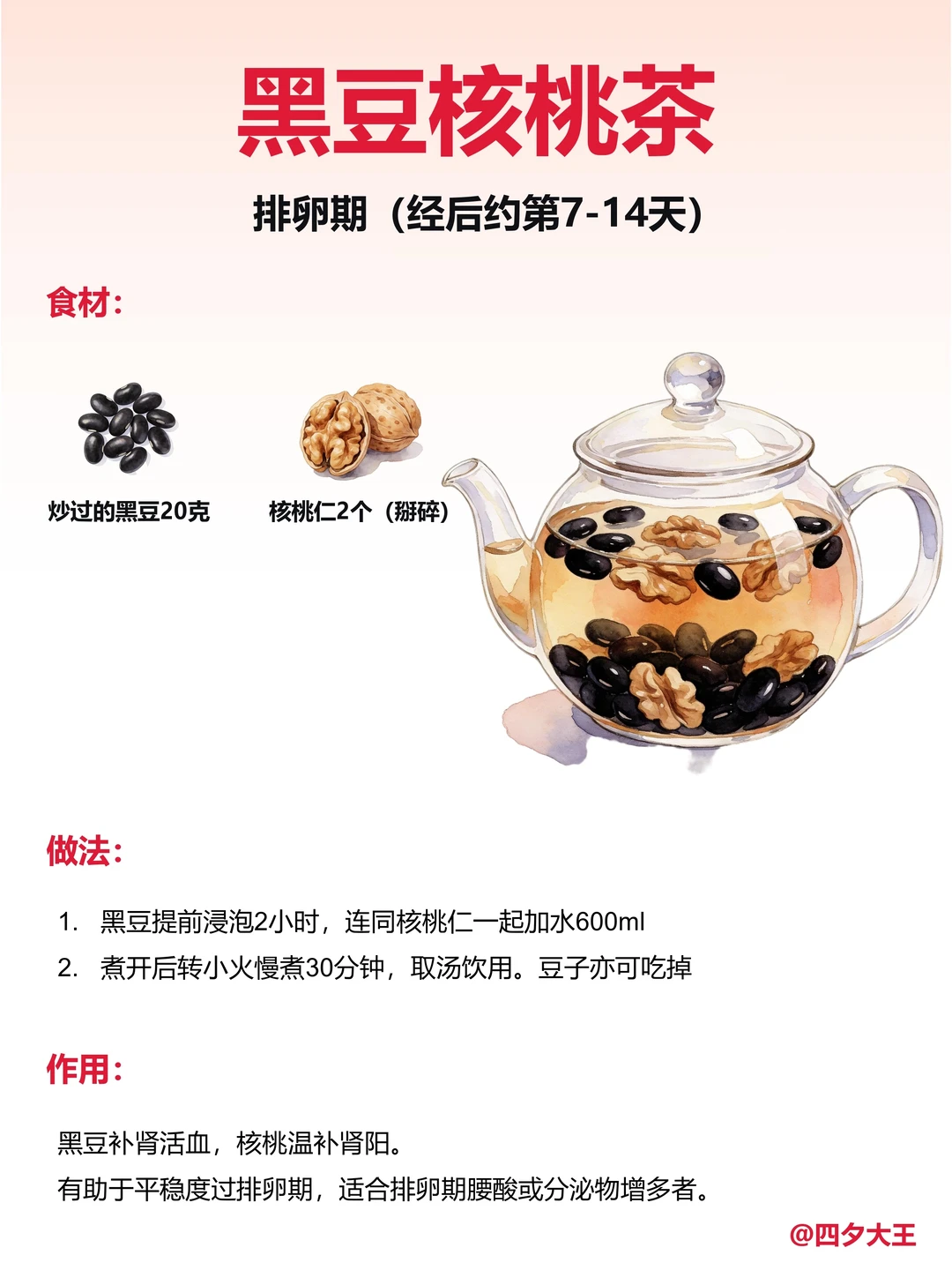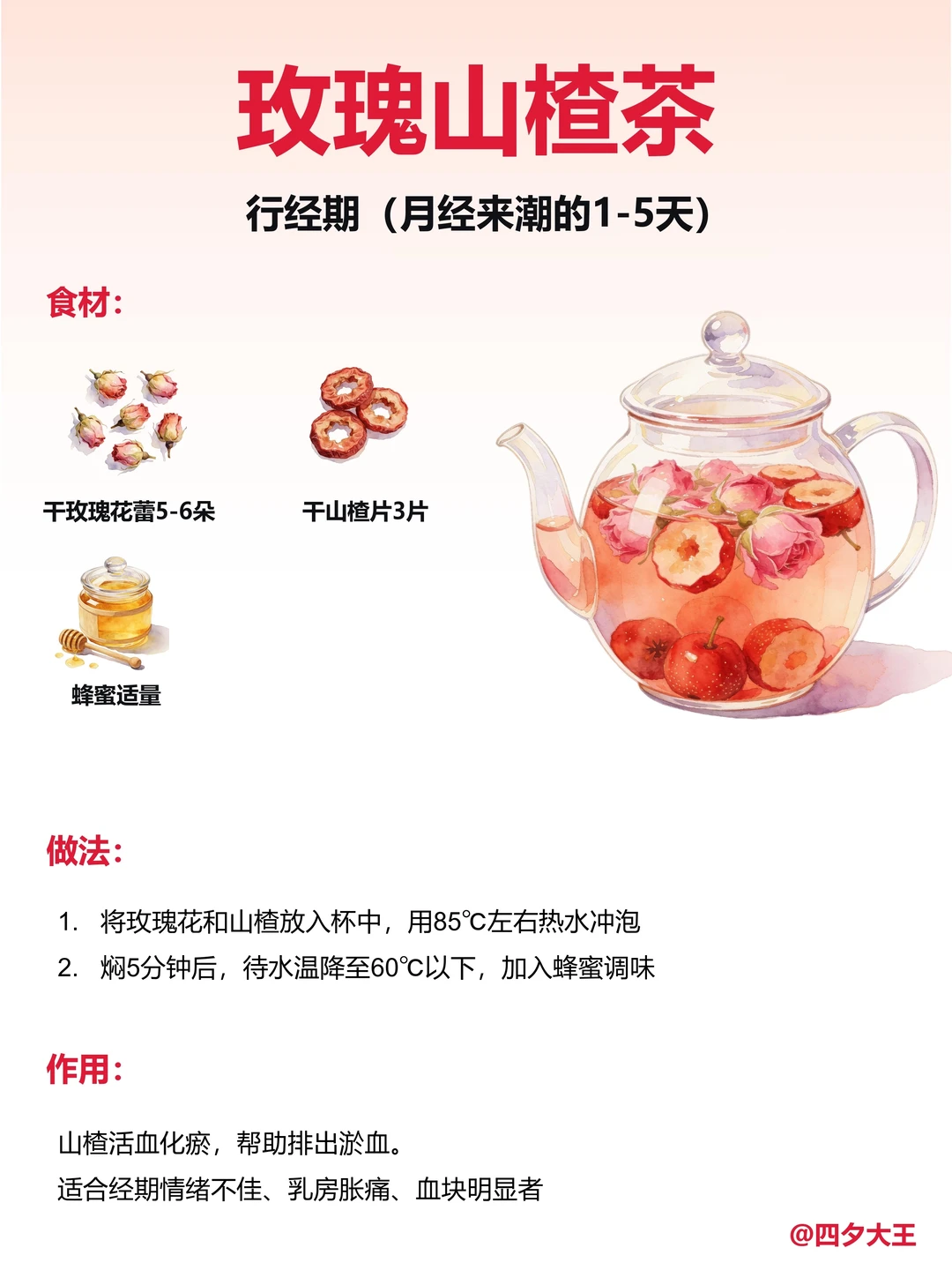 . 6款养生茶饮,常喝提气血🩸~ 气色不好的姐妹,快去试试 跟着28天慢慢调理~ ▪️行经期: 红糖姜枣茶 玫瑰山楂茶 ▪️经后期: 桑葚枸杞茶 ▪️排卵期: 黑豆核桃茶 百合莲子银耳饮 ▪️经前期: 佛手柑陈皮茶