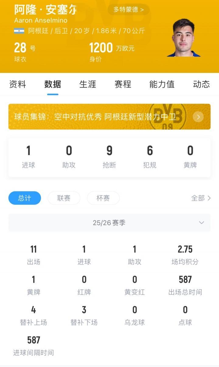 安塞尔米诺现年20岁,阿根廷后卫。本赛季他为球队出场11次,贡献1粒进球和1次助攻,目前其德转身价为1200万欧。