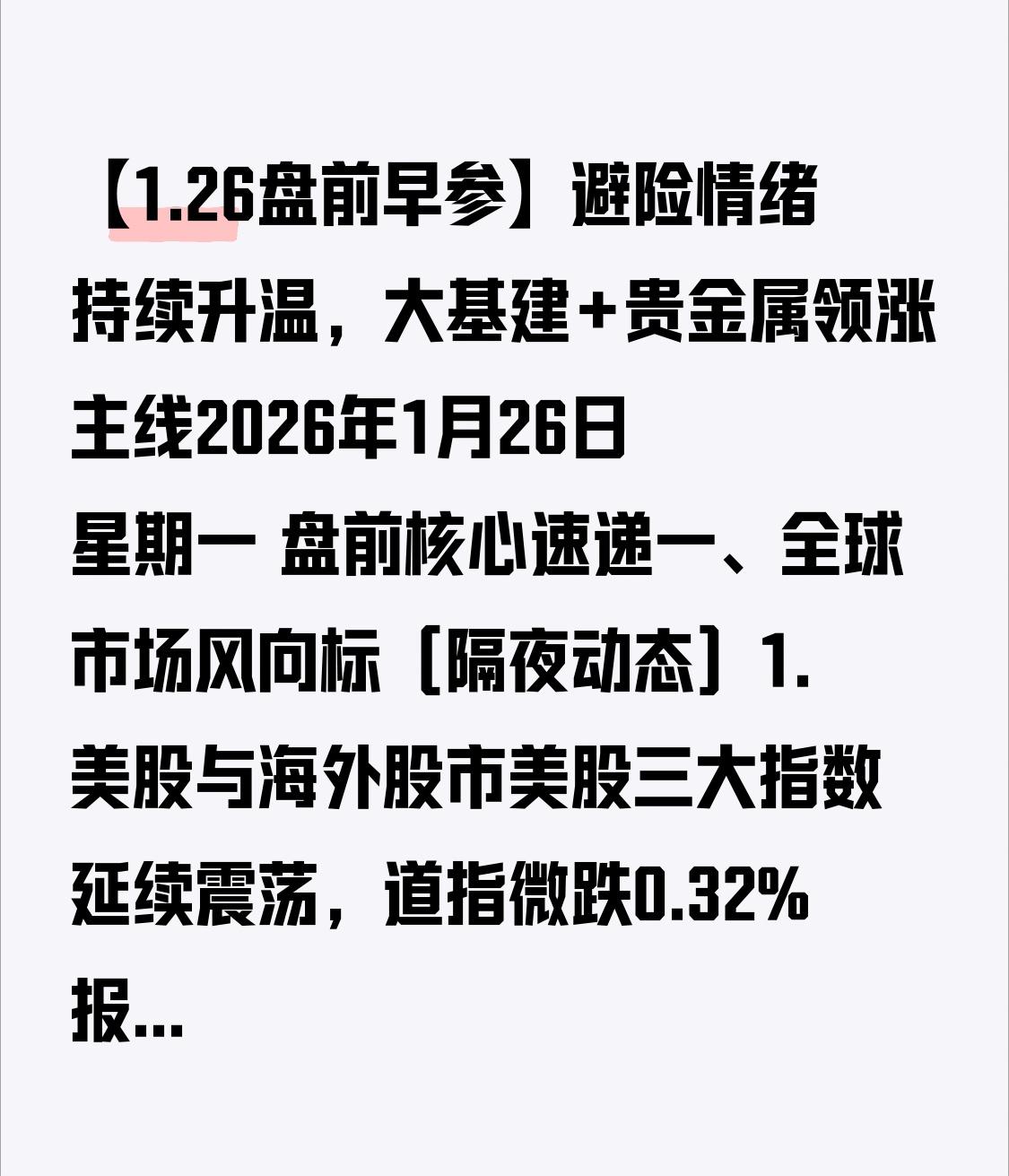 【1.26盘前早参】避险情绪持续升温,大基建+贵金属领涨主线 2026年1月26日 星期一 盘前核心速递 一、全球市场风向标(隔夜动态) 1. 美股与海外股市 美股三大指数延续震荡, 道指微跌0.32%报48335.21点, 标普500跌0.85%报6738.24点, 纳指跌1.12%报22703.65点; 科技股分化,英伟达跌2.1%,苹果微涨0.4%。 欧洲STOXX 600指数涨0.23%,地缘局势缓和带动风险情绪小幅回暖,但VIX仍维持在高位,避险需求未完全消退。 2. 大宗商品与汇率 贵金属: COMEX黄金期货涨1.24%报4824.30美元/盎司,续创历史新高; COMEX白银期货涨2.17%报96.52美元/盎司,避险买盘持续支撑。 能源类: WTI原油涨0.78%报60.81美元/桶,布伦特原油涨0.92%报65.54美元/桶; 美国天然气期货涨3.1%,维持高位震荡。 汇率:美元指数跌0.21%报97.83,人民币汇率盘中升破6.94,离岸人民币汇率走强,外资流入预期升温。 3. 其他重要动态 比特币反弹至9.2万美元上方,但仍未收复前期跌幅; 以太坊回升至3100美元附近,加密货币市场情绪边际改善。 二、国内政策与行业动态 1. 大基建加码:国家能源局明确2026年电网投资超4万亿元,特高压、智能电网、新型储能等领域迎来订单爆发期,相关产业链公司业绩确定性增强。 2. 贵金属政策催化:央行持续增持黄金储备,国内多家银行扩大贵金属业务布局,叠加全球避险情绪升温,黄金、白银板块获资金持续追捧。 3. 消费复苏信号:春节假期临近,餐饮、旅游、免税等消费板块迎来节前备货行情,多地发布促消费政策,带动线下消费场景回暖。 三、重要公司公告汇总摘要 1. 特变电工(600089):公告中标国家电网特高压项目,合同金额超28亿元,占公司2024年营收的7.2%,预计将显著增厚2026年业绩。 2. 山东黄金(600547):公告旗下金矿探获新增黄金资源量12吨,预计新增年产能约1.5吨,长期业绩增长动力增强。 3. 东方电缆(603606):公告收到海上风电项目订单,金额约16.3亿元,占公司2024年营收的9.1%,进一步巩固行业龙头地位。 4. 中国中免(601888):公告三亚海棠湾免税城春节前备货完成,预计假期销售额同比增长超30%,消费复苏直接受益。 5. 阳光电源(300274):公告与某电力集团签订10GWh储能设备订单,金额超22亿元,新型储能业务加速放量。 四、今日重点关注 1. 宏观数据:今日将公布1月制造业PMI初值,市场预期延续扩张态势,关注数据对周期板块的催化。 2. 事件驱动:2026年全国能源工作会议今日召开,关注新型电力系统、绿电转型等政策表述。 3. 资金流向:北向资金上周净买入超120亿元,今日关注大基建、贵金属板块的资金延续性。 今日策略参考: 市场延续结构性行情,优先关注贵金属(避险主线)、大基建(电网投资)、消费复苏(节前行情)三大方向,短线可围绕强庄股低吸,波段布局业绩确定性高的品种,控制仓位,不盲目追高。 免责声明:以上仅为个人盘前信息整理,不构成任何投资建议,市场有风险,交易需谨慎。