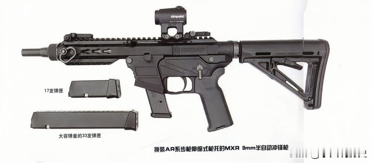 美国FightLite工业公司MXR半自动冲锋枪 美国FightLite公司本来就靠做AR系列步枪的上机匣出名,现在新出了一款MXR半自动冲锋枪,发射9亳米巴拉贝鲁姆手枪弹。 该枪的弹匣能和格洛克手枪通用,不管是17发的普通弹匣,还是33发的大容量弹匣都能用。 弹匣座和下机匣是分开的,上机匣和护手连在一起,顶部有一整条长导轨,下面也有导轨,装瞄准镜、握把这些配件很方便。 护手左右两边有Key-Mod接口,也能加装导轨。 下机匣看着和AR系卡宾枪挺像,保险是M4那种水滴形状的,枪尾是简易片状枪托,也能换成AR步枪的伸缩枪托。 最厉害的是它能免工具换口径,换枪机、枪管和弹匣座,就能用0.22英寸LR、0.45英寸ACP这些常见手枪弹了。