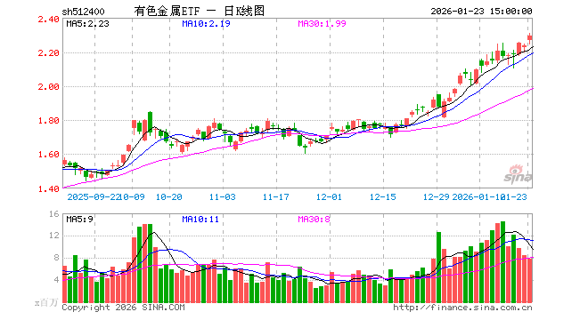1月23日,有色金属ETF(512400)涨2.55%,成交额17.85亿元。当日份额增加2.58亿份,最新份额为165.98亿份,近20个交易日份额增加66.09亿份。最新资产净值计算值为380.03亿元。