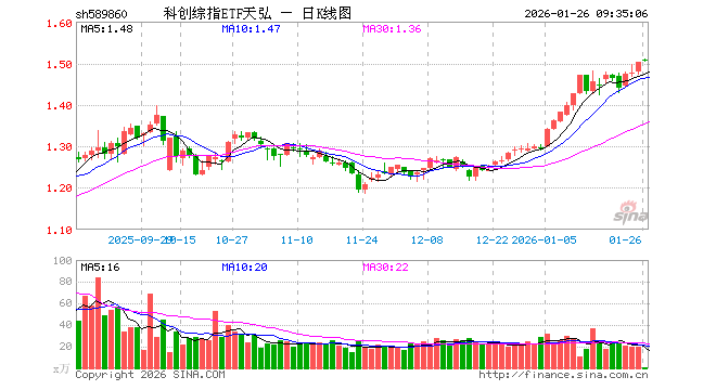 1月26日,科创综指ETF天弘(589860)开盘涨0.33%,报1.507元。科创综指ETF天弘(589860)重仓股方面,寒武纪开盘跌0.75%,海光信息跌0.18%,中芯国际跌0.76%,中微公司跌0.15%,金山办公涨1.71%,澜起科技跌1.14%,百利天恒跌0.14%,联影医疗涨1.33%,拓荆科技跌1.99%,影石创新涨0.01%。