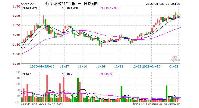 数字经济ETF工银(561220)业绩比较基准为中证诚通国企数字经济指数收益率,管理人为工银瑞信基金管理有限公司,基金经理为史宝珖,成立(2025-05-21)以来回报为60.97%,近一个月回报为15.55%。