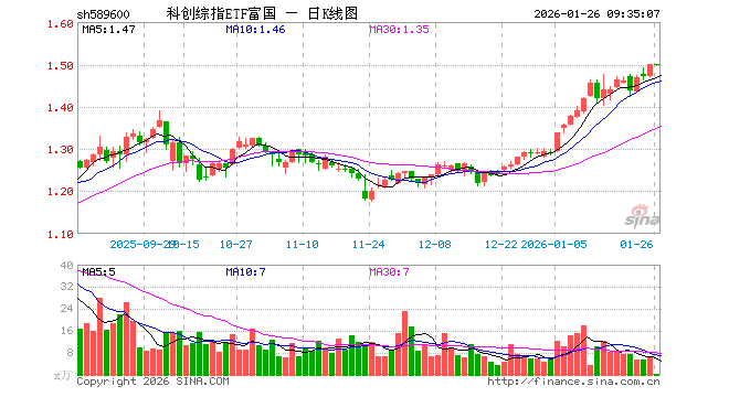 1月26日,科创综指ETF富国(589600)开盘涨0.07%,报1.500元。科创综指ETF富国(589600)重仓股方面,寒武纪开盘跌0.75%,海光信息跌0.18%,中芯国际跌0.76%,中微公司跌0.15%,金山办公涨1.71%,澜起科技跌1.14%,百利天恒跌0.14%,联影医疗涨1.33%,影石创新涨0.01%,拓荆科技跌1.99%。