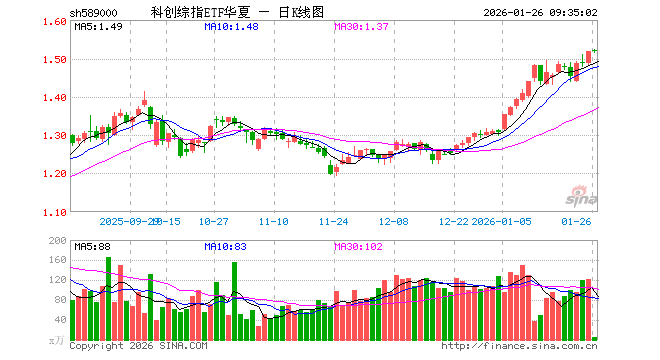 1月26日,科创综指ETF华夏(589000)开盘涨0.20%,报1.520元。科创综指ETF华夏(589000)重仓股方面,寒武纪开盘跌0.75%,海光信息跌0.18%,中芯国际跌0.76%,中微公司跌0.15%,金山办公涨1.71%,澜起科技跌1.14%,百利天恒跌0.14%,联影医疗涨1.33%,影石创新涨0.01%,拓荆科技跌1.99%。