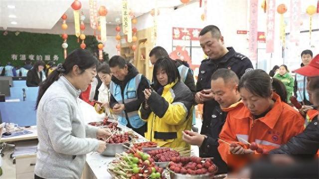 另一个角落的爱心糖葫芦制作区则香气四溢。工作人员冯瑞芳正忙着给大家分发新鲜的山楂、水果和竹签,电磁炉上的冰糖熬得晶莹剔透,冒着细密气泡。“大家别着急,慢慢串,裹糖的时候小心烫着。”快递员闫双林平时手脚麻利,串糖葫芦却有些手忙脚乱,旁边的交警大哥笑着帮他扶着竹签,两人合作完成了一串饱满的糖葫芦。咬上一口,酸甜的滋味在舌尖化开,闫双林笑着说:“这是我第一次自己做糖葫芦,比买的还好吃!”