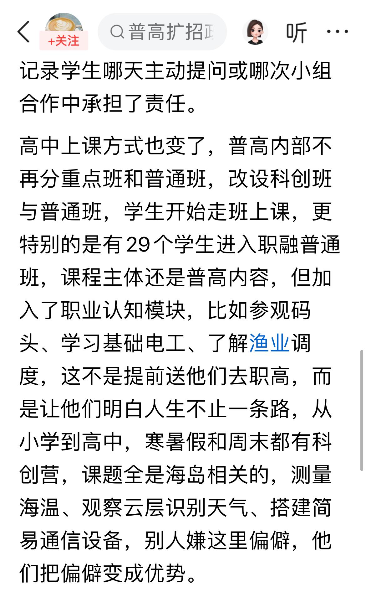 嵊泗县全员高中来了!妈妈再也不用担心我的学习了? 2025年,嵊泗县普高报名人数266人,全部录取,就读率81%,也就是216人,其中29人在普高的普职融通班,学习电工、渔业调度等! 现在高中数理化的难度,考入重点高中的学生进入普高学习都觉得很难,物理化学考30、40分,数学考个7、80分也是常态! 所以,都读普高还是很难的。为了给职高生更多选择,多数地方是职高里开普职融通班,嵊泗县采取的是普高里开普职融通班。 这样,家长是不是更能接受!
