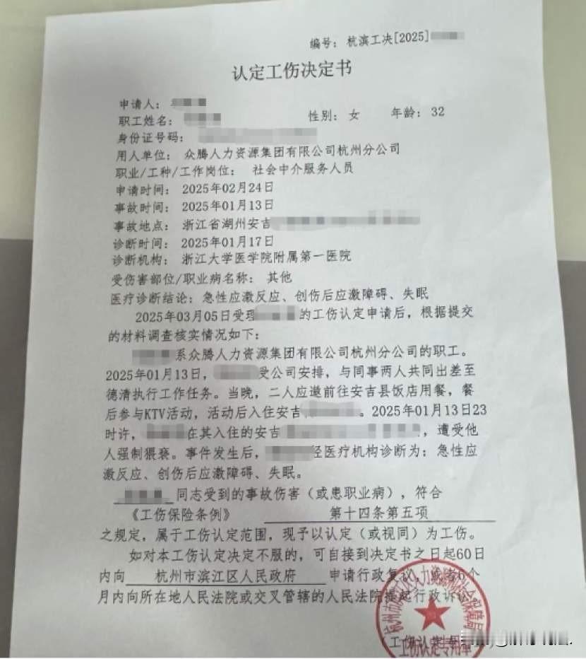 “太缺德了!”浙江杭州,女子在某公司上班,一日,被安排到外地出差。当晚陪客户6人聚餐,期间,几人喝了4瓶白酒。随后,又去唱歌唱到很晚。散场后,女子回到酒店休息。万万想不到,女子睡到半夜,发现被窝里多了一个人,还顶着自己的身体,女子吓坏了,接下来,女子是这样做的。 33岁的刘女士,入职5个月就被派去湖州出差。 当晚和总经理、客户金某等6人聚餐,喝了4瓶白酒。本来要转去其他城市,金某非要挽留,还安排了星级酒店,刘女士不好拒绝只能留下。 唱完歌到半夜,金某给了刘女士房卡,她回房很快睡着。 没料到金某偷偷找前台多要了张房卡,光着身子溜进她房间钻被窝,还动手摸她、用下身顶她。 刘女士惊醒摸到光溜溜的陌生男人,吓得魂都没了,金某还不让开灯,她赶紧下床跑去前台报警。 金某因猥亵罪被判9个月,刘女士却患上急性应激反应,得休养一个月。 可等她休完假回公司,竟被要求主动辞职,公司还转来10万想让她删帖。 刘女士没妥协,一边做精神鉴定一边维权,成功拿到工伤认定。 最终公司被判支付拖欠工资、交通费、医疗费共24955元,刘女士还坚持要公司公开道歉,总算为自己讨回了公道。 这事儿看得人火冒三丈!刘女士真是倒了八辈子血霉,出差公干遭客户猥亵,公司不仅不撑腰,还想着用钱封口逼辞职,俩操作没一个是人干的! 金某这畜生,表面热情好客,背地里一肚子坏水,偷偷复制房卡溜进女员工房间,光身子耍流氓,简直无耻到极点!被判9个月都算轻的,就该让他在牢里好好反省,知道什么叫尊重女性、遵纪守法。 刘女士受了这么大惊吓,患上急性应激反应,精神和身体双重遭罪,换谁都得留下心理阴影。 更让人恶心的是刘女士的公司!员工因公出差遭遇侵害,公司不想着维权撑腰,反而怕影响声誉,甩10万就想逼人家辞职删帖,这哪是企业,分明是没良心的冷血机器! 眼里只有利益,完全不管员工的死活和尊严,这种处理方式比金某的恶行更让人寒心。 好在刘女士够刚,没被威胁利诱打垮,硬着头皮做鉴定、维权,总算拿到工伤认定,要回了该得的赔偿。 结果大快人心,既让金某付了法律代价,也给无良公司上了一课。 这事儿也给所有打工人提了醒:出差在外一定要保护好自己,遇到侵害别忍气吞声,该报警就报警;同时也盼着企业能有点担当,别遇事就想着甩锅封口,员工的安全和权益才该是第一位的! 刘女士要公司公开道歉,就该这么硬气,就得让犯错的人低头认错!