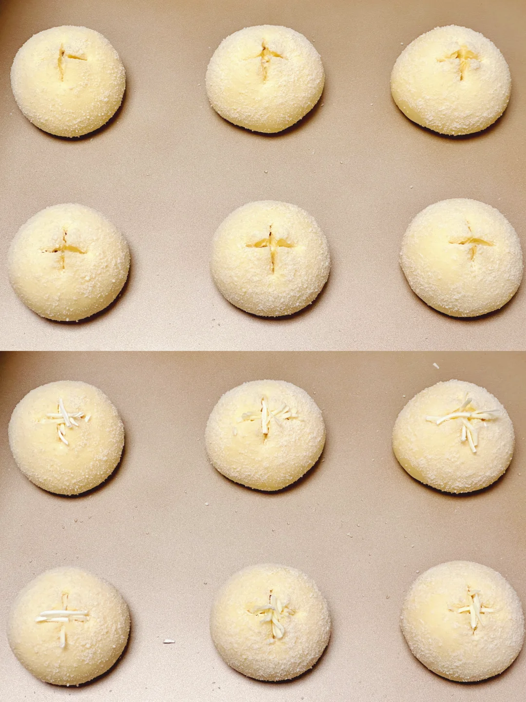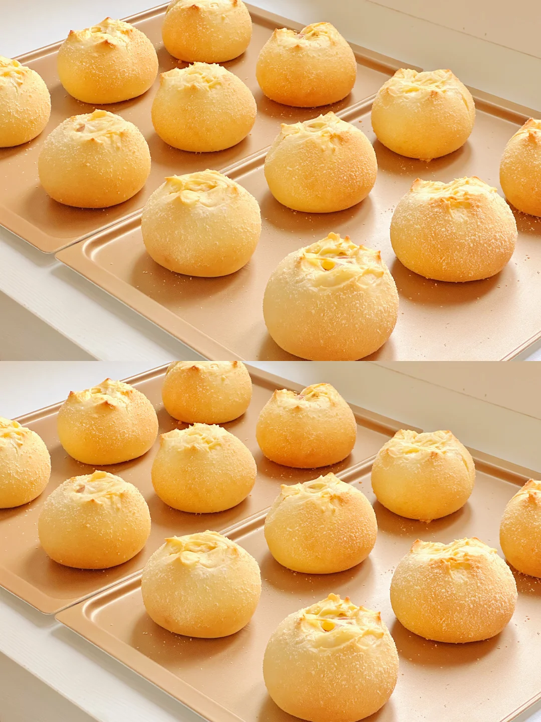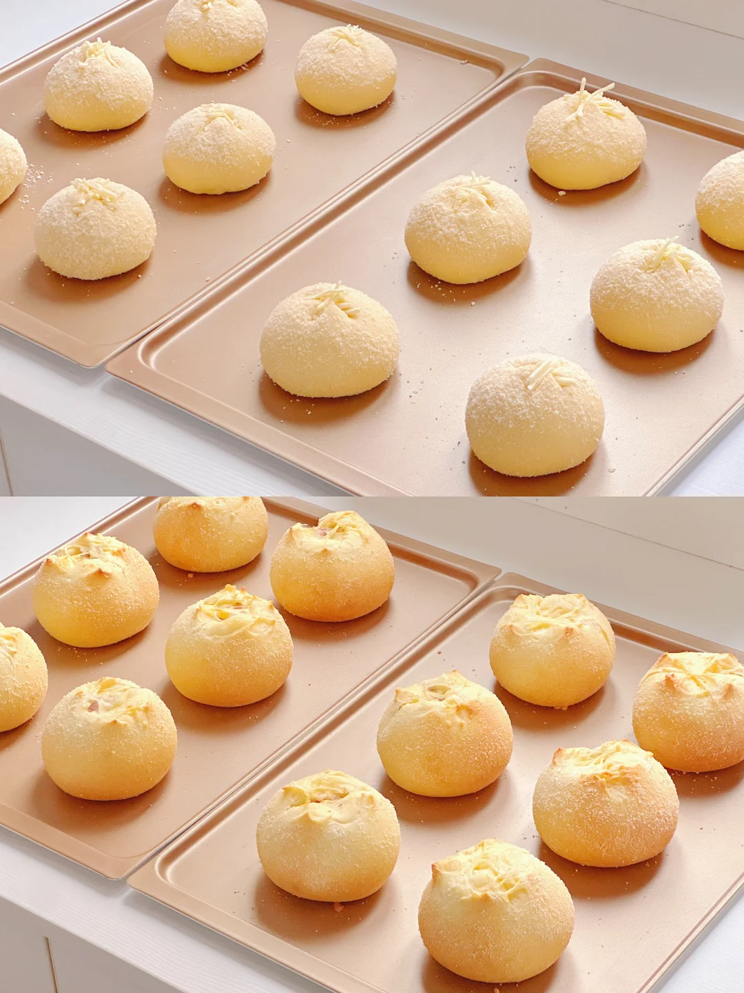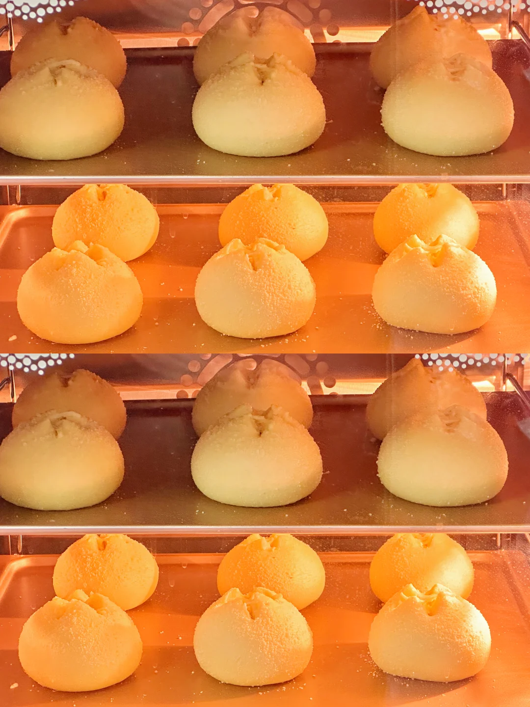 5️⃣依次做好,放入发酵箱内温度32°C左右,湿度80%的环境下发酵至2倍大,打开烤箱提前预热,放入预热好的烤箱风炉模式155度烤15分钟左右。