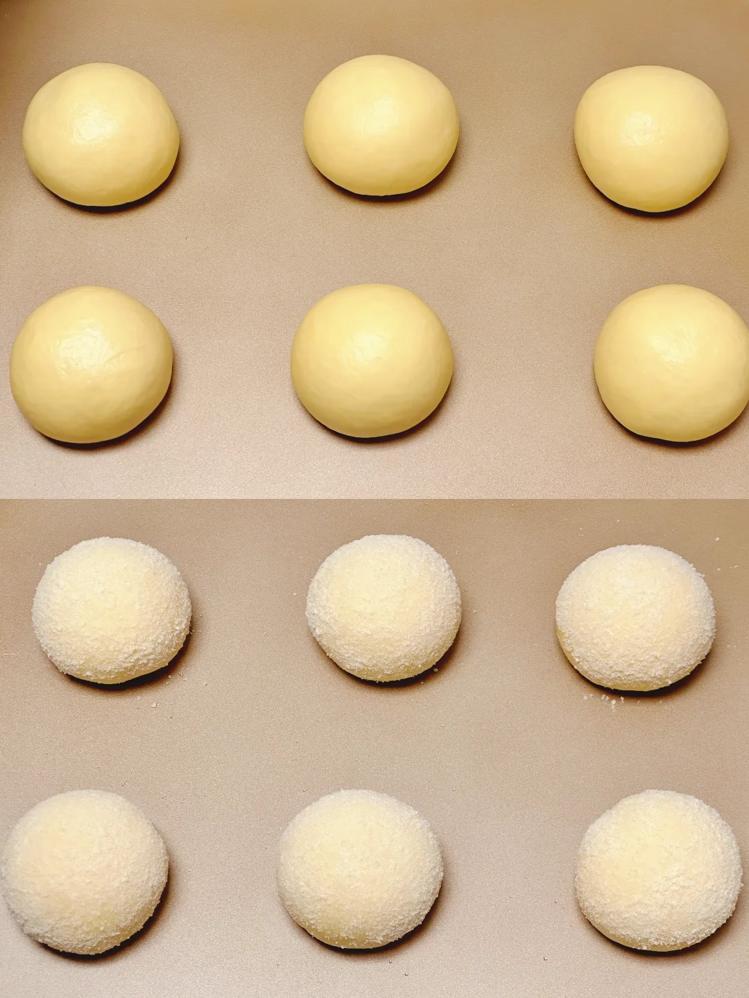 3️⃣取出发酵好的面团按压排气分成12份,滚圆盖保鲜膜松弛20分钟。
