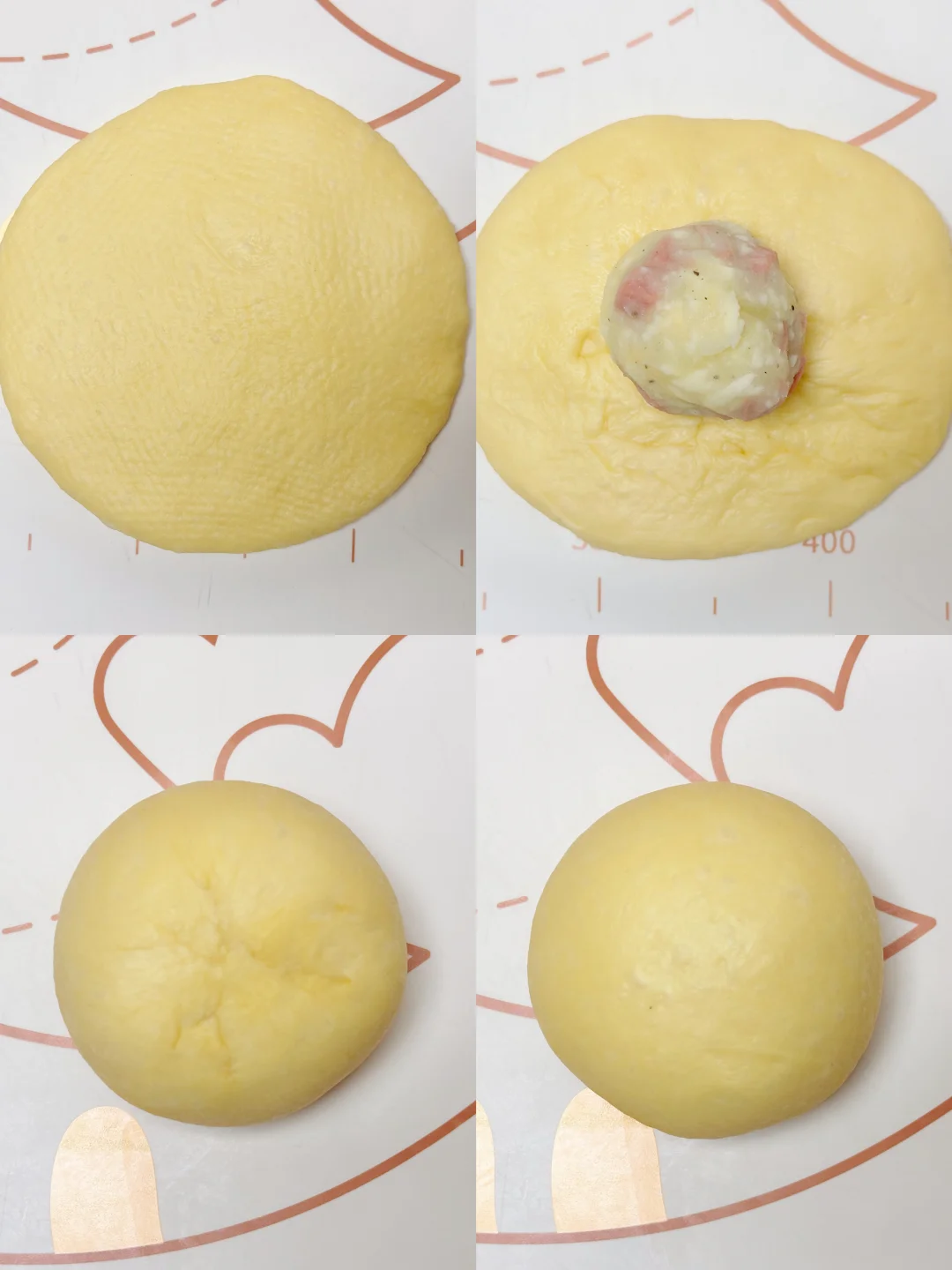 4️⃣取一个松弛好的面团擀成圆形面片,放上馅料,包好,收口捏紧,表面喷少许水,沾上芝士粉。