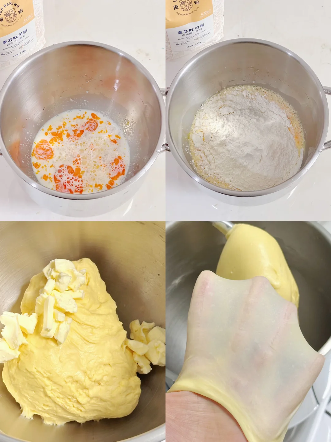 1️⃣将面团中除黄油外的所有食材放入厨师机桶内,厨师机低速搅拌至无干粉,转中高速打至能扯出厚膜,加入软化好的黄油开低速揉至黄油吸收,再转高速揉至能扯出薄膜即可。