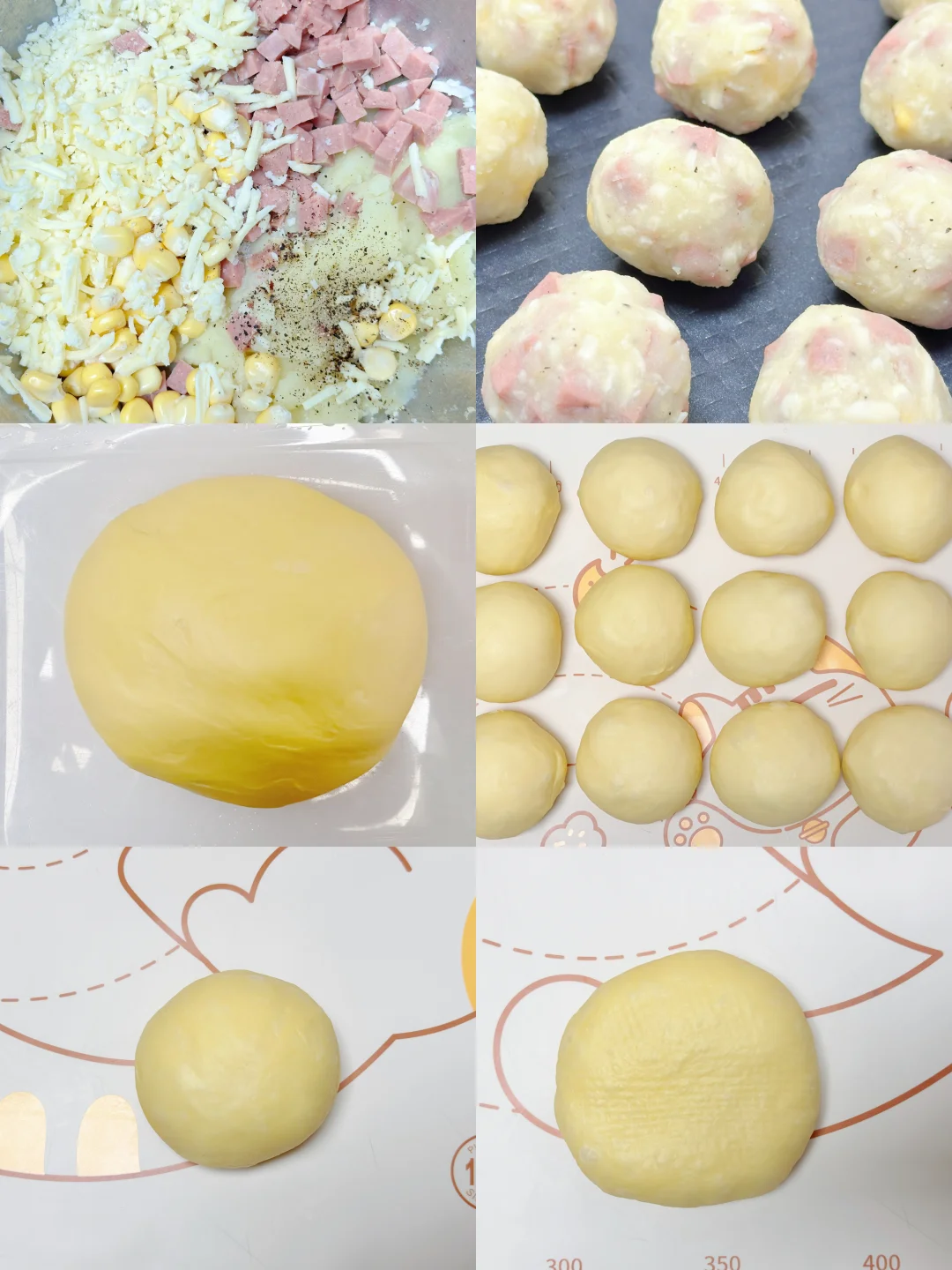 土豆泥180g|脆皮肠90g|芝士碎90g|玉米粒适量|盐2g|黑胡椒碎适量