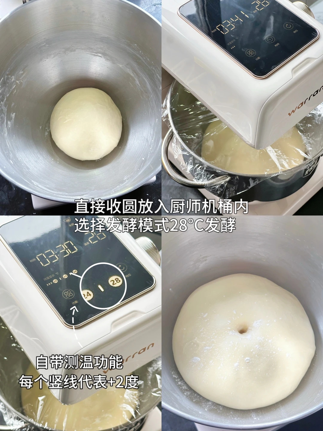 2️⃣将揉好的面团收成团直接放入厨师机桶内,选择发酵模式,设置28°C发酵至2倍大。