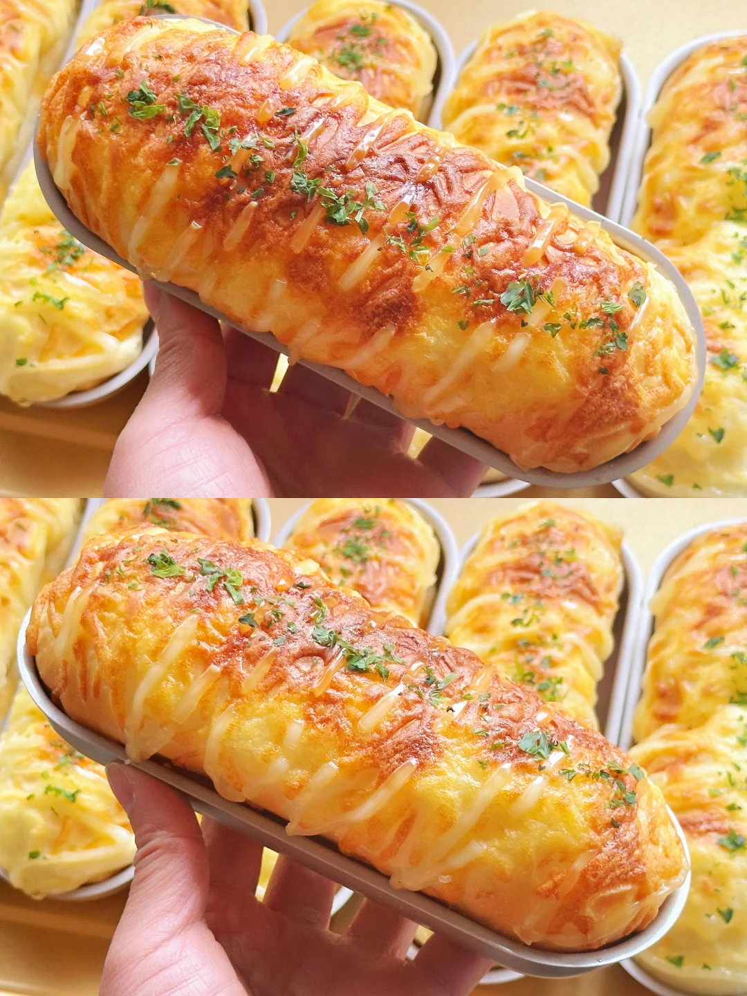 表面撒芝士碎烤出来的面包表皮脆脆的,真的超级香,出炉就能干掉几个!