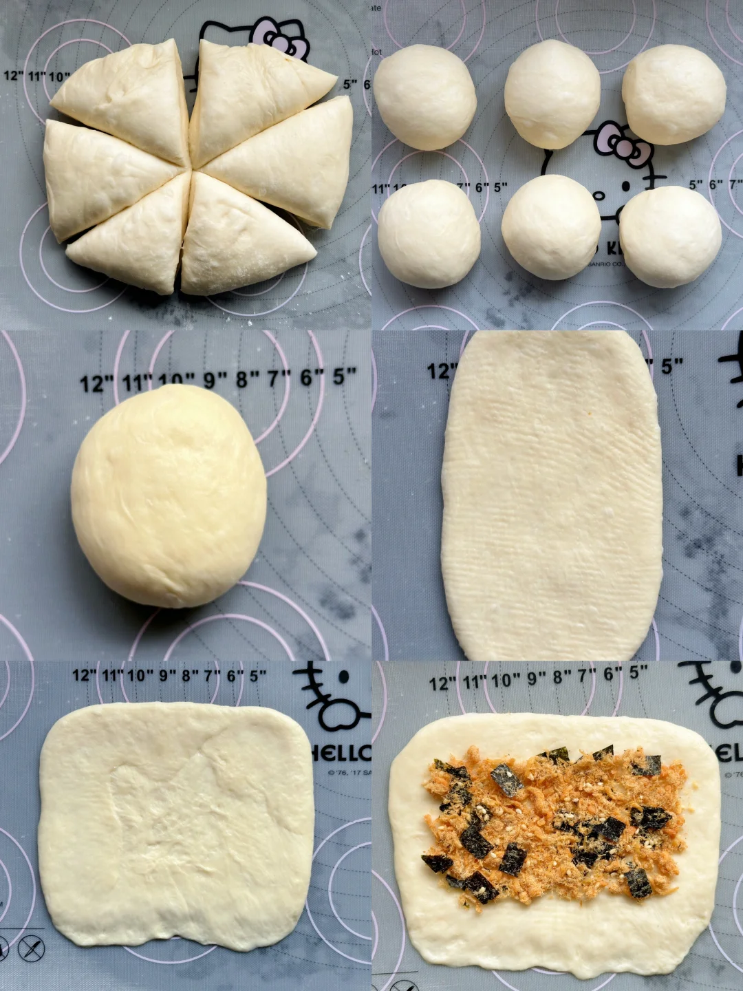 3️⃣发酵好的面团按压排气,分成6份,滚远松弛20分钟。