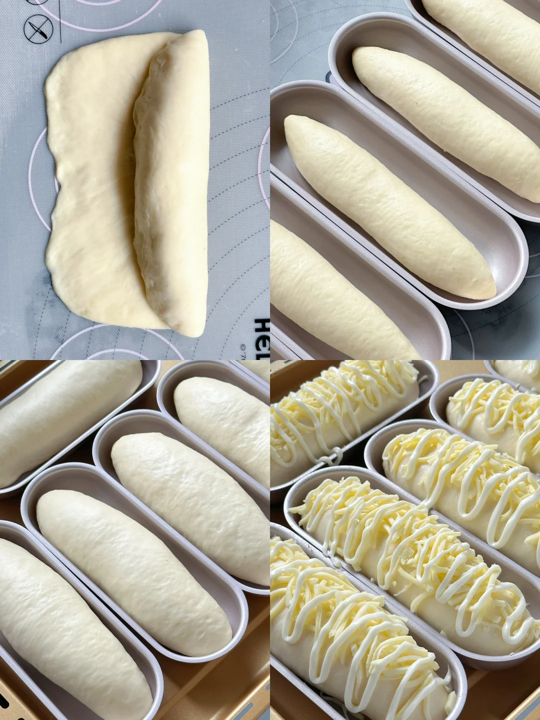 4️⃣取一个松弛好的面团,光面朝上,擀成长方形面片,翻面,底部打薄,放上适量肉松,卷起,收口捏紧,放入模具中。