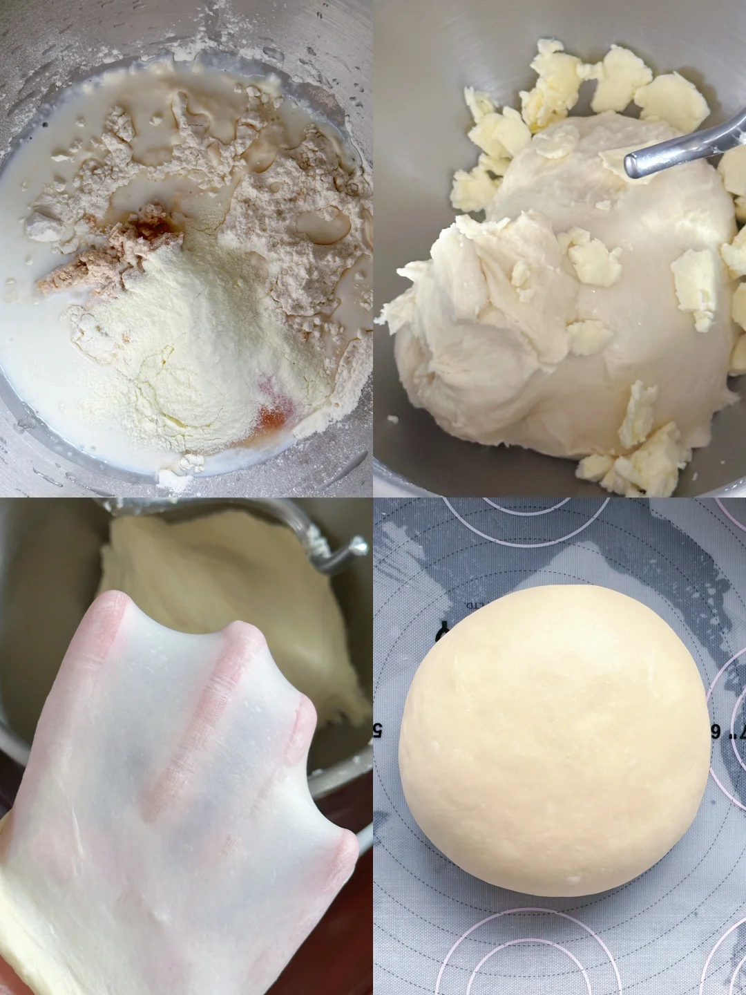 1️⃣除黄油以外的所有面团材料放入厨师机桶内厨师机1或2档搅拌至无干粉,切换至5~6档打至能扯出厚膜,加入软化好的黄油开3档揉至黄油吸收,再切换至5-6档揉至完全拓展阶段,能扯出薄膜即可。