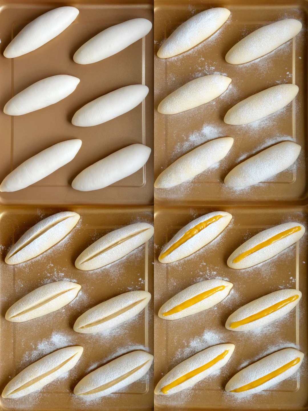 5️⃣全部做好后放入发酵箱,温度32°C左右,湿度80%的环境下发酵至2倍大。发酵好表面筛上面粉,中间割开一厘米深的口子,挤上岩烧乳酪酱。