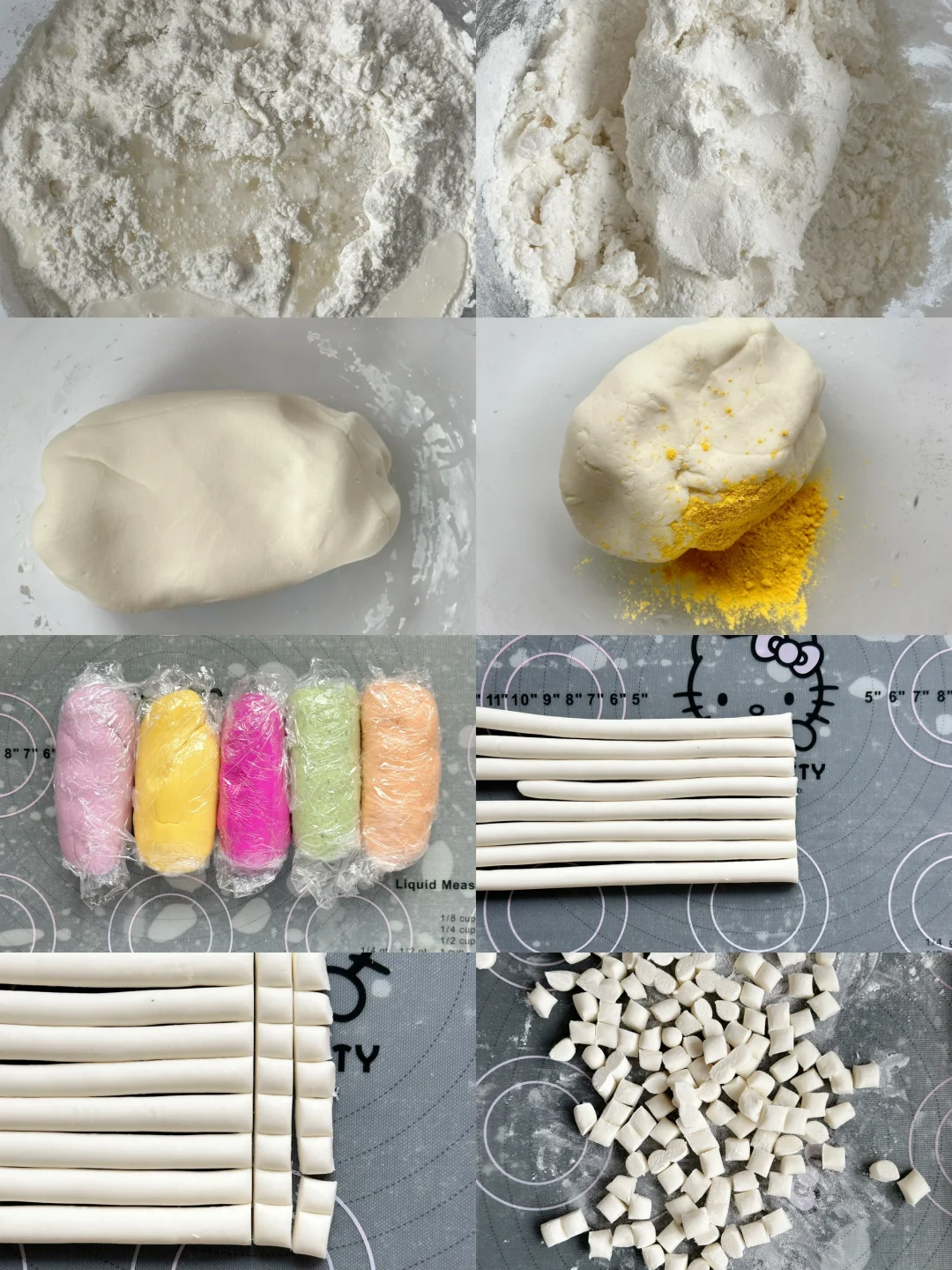 5️⃣每个糯米团搓成细长条,再用切刀切成小丁,每个小丁分别搓圆即可。