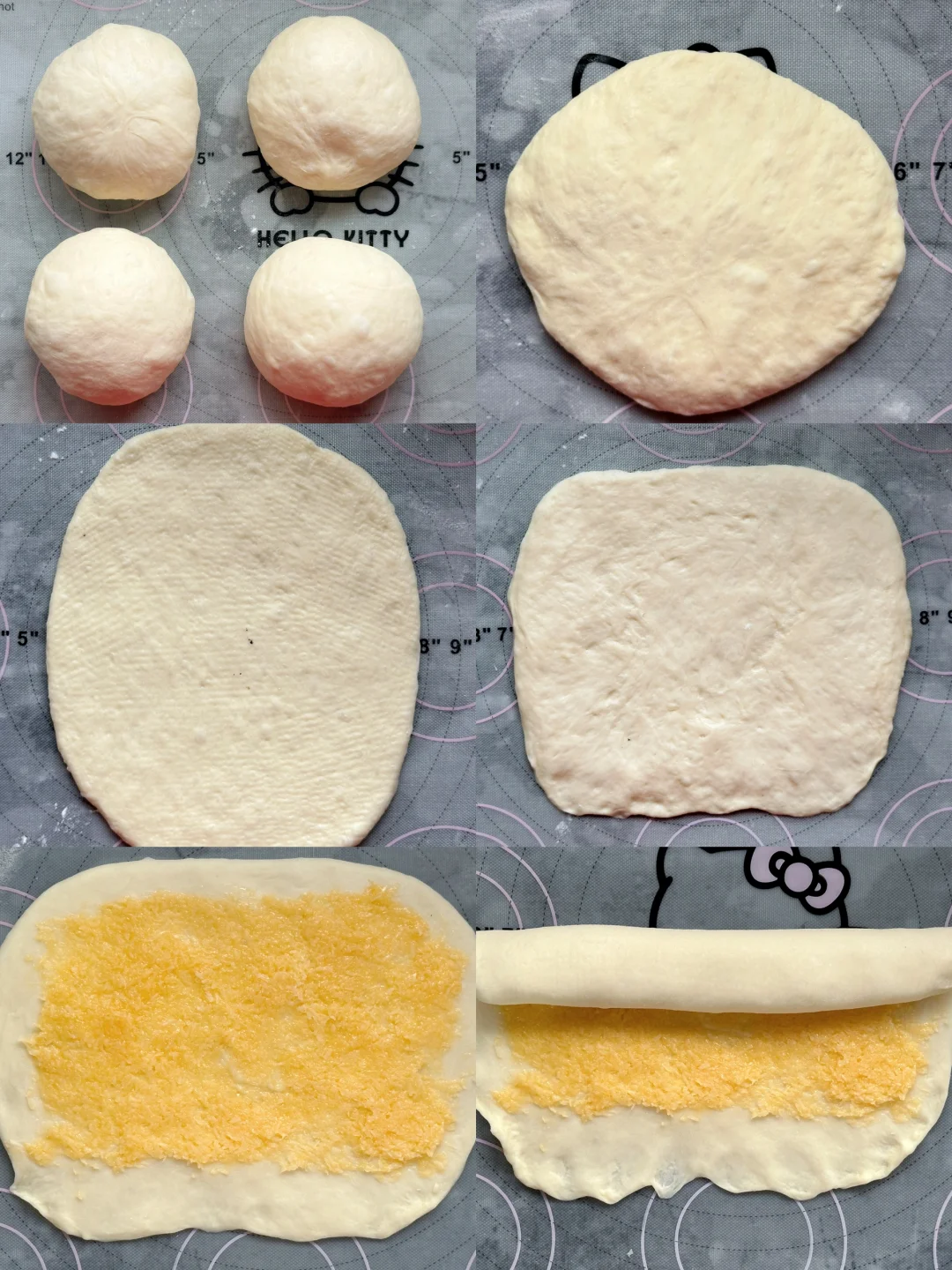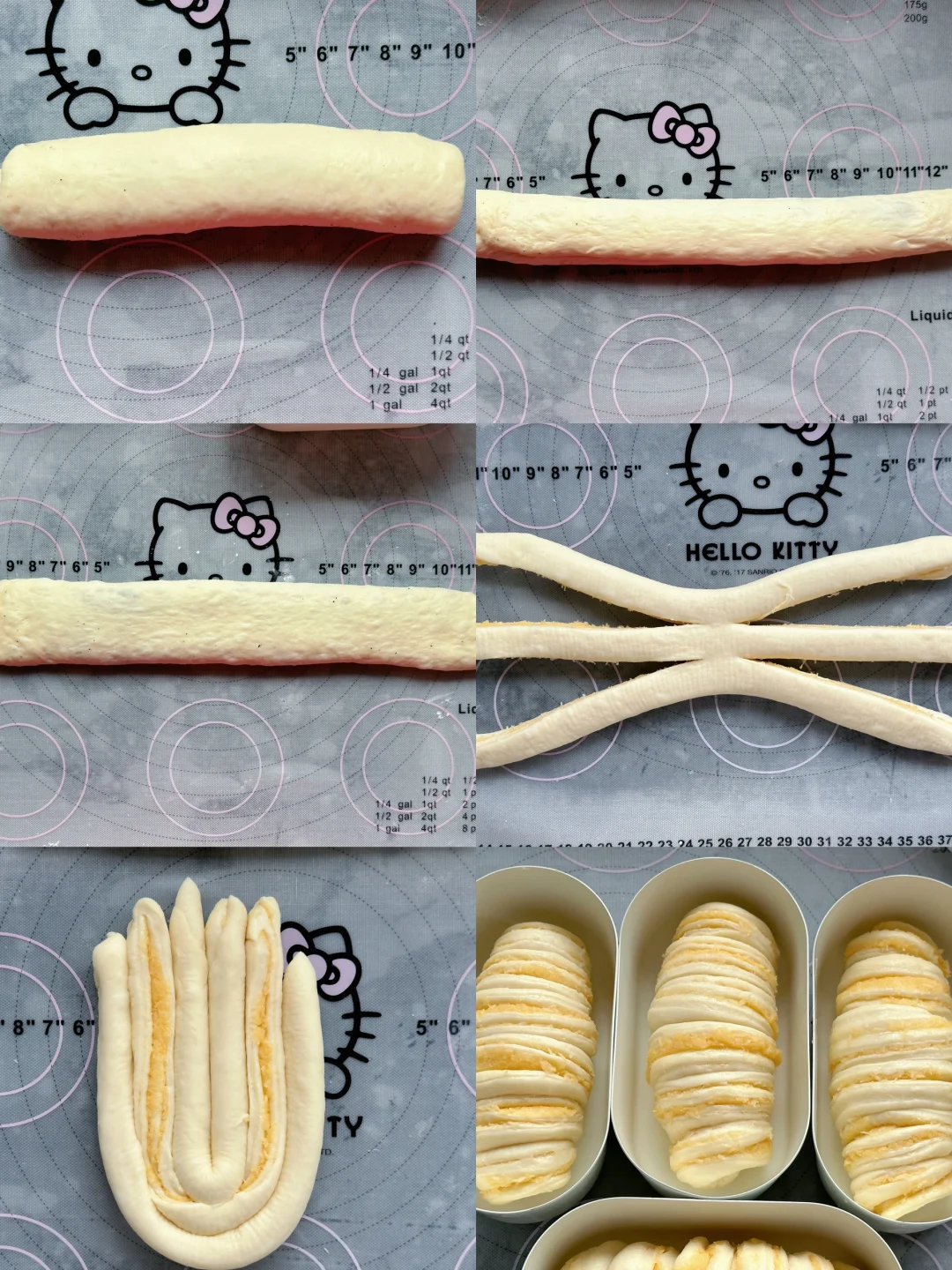 3️⃣ 取一个松弛好的面团,压扁,擀成长方形面片,翻面抹上奶酥馅,从上往下卷起,收口处捏紧,稍微搓长一点,压扁,左右两边分别切开,将切面朝下,并拢一起,从上往下卷起,接口处朝下放入模具中。