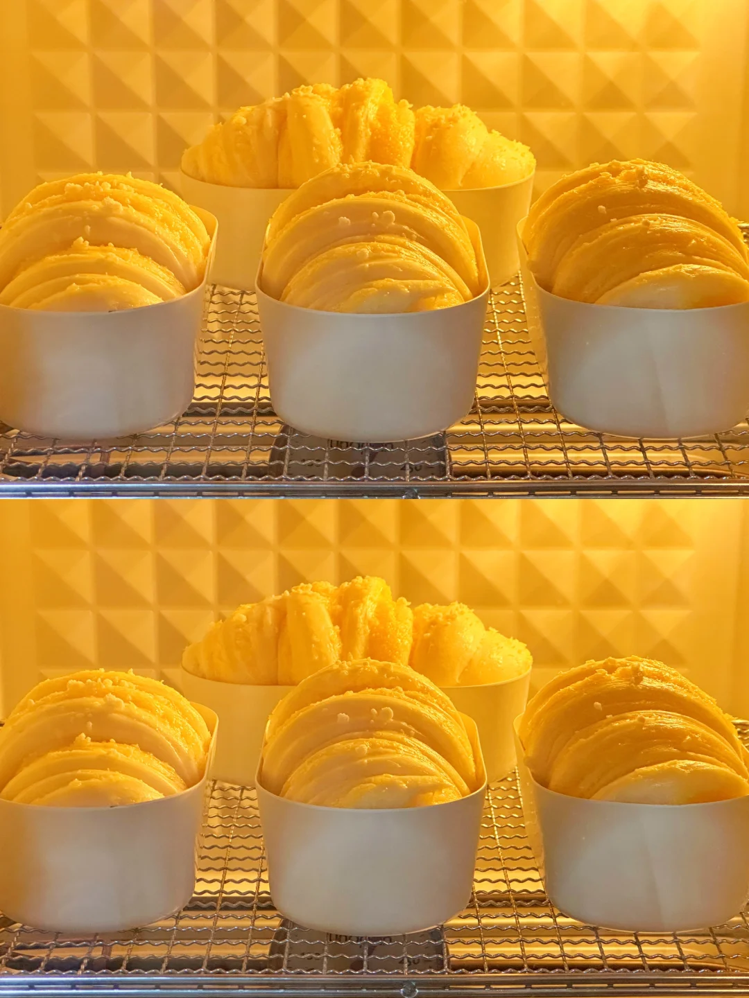 4️⃣ 温度32°C左右,湿度80%的环境下发酵至模具十分满,表面刷上蛋黄液,撒上少许酥粒。