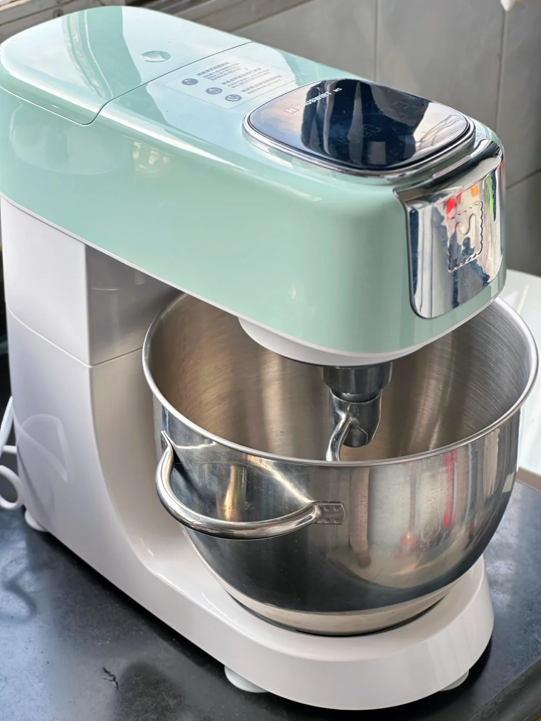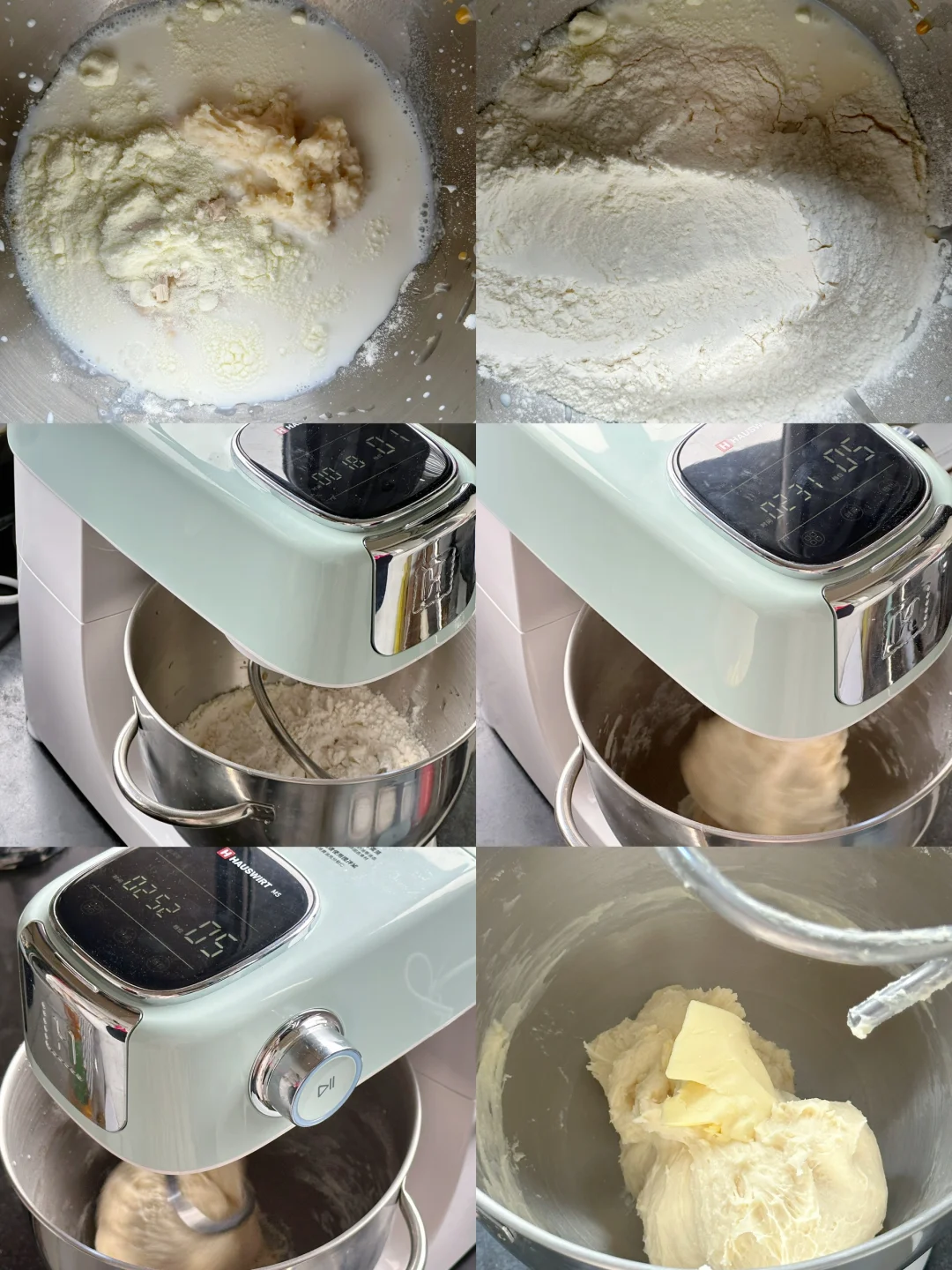 1️⃣ 除黄油外的所有主面团食材和种面团放入海氏M5厨师机桶内,厨师机1或2档搅拌至无干粉,切换至4-5档打至能扯出厚膜,加入软化好的黄油开2档揉至黄油吸收,再切换至4-5档揉至完全拓展阶段,能扯出薄膜即可。