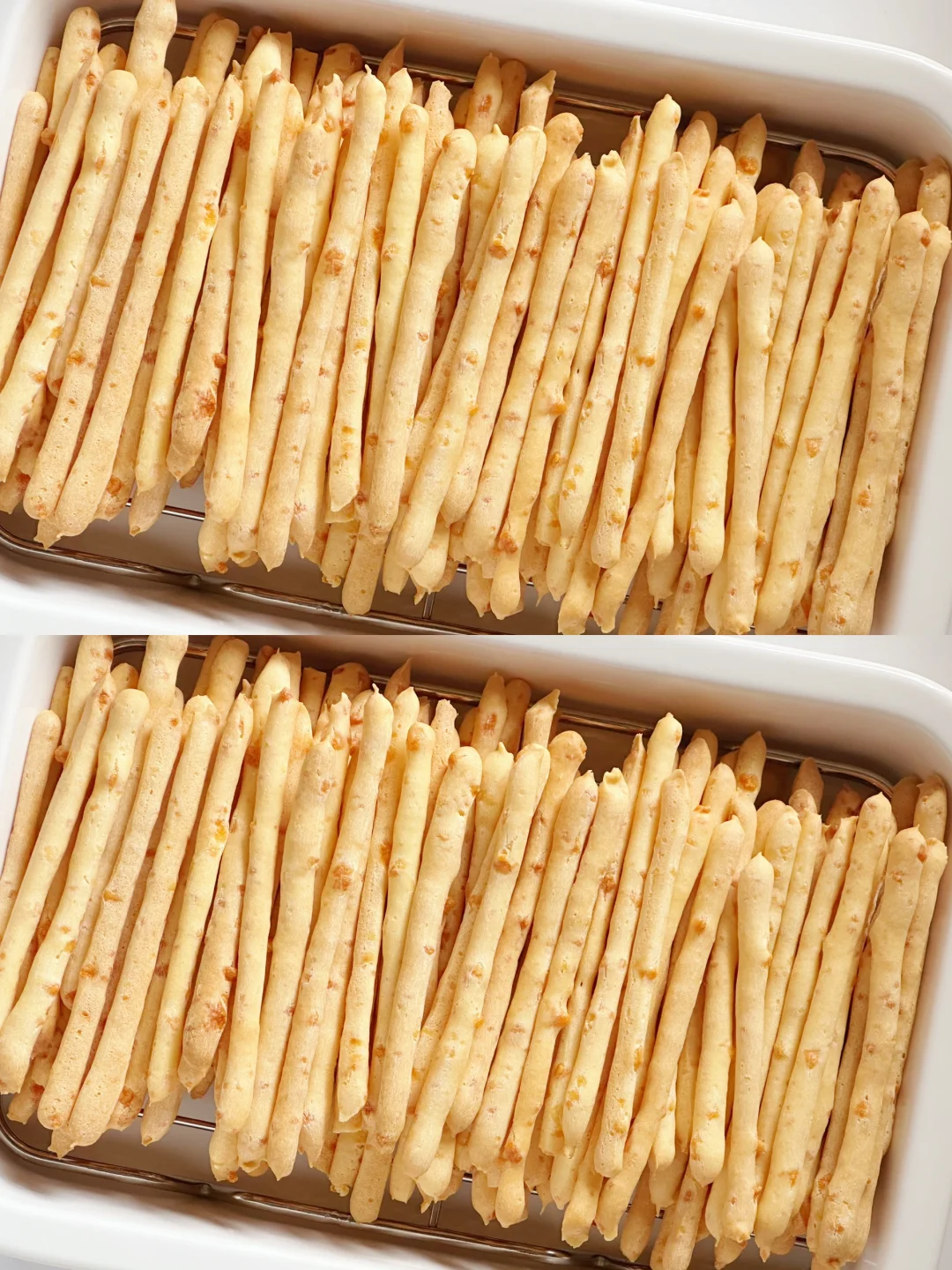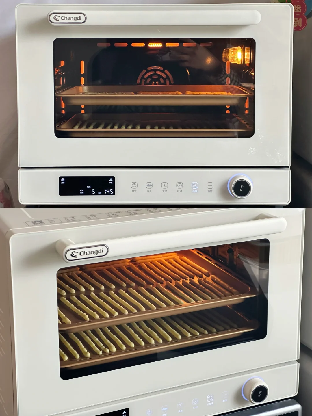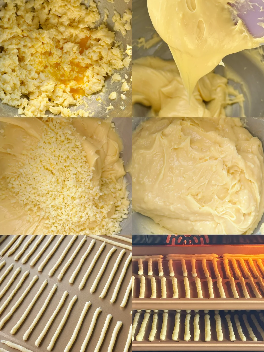 5⃣️将芝士糊装入裱花袋,烤盘上挤长条状,送入长帝大白鲸S1pro烤箱风炉模式145°C烤30分钟左右,烘烤时间根据挤的粗细决定