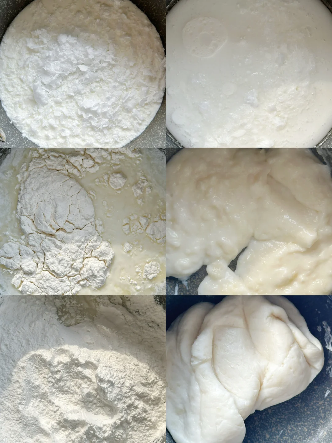 2⃣️ 将牛奶、椰子油、糖、盐倒进奶锅中,小火煮至糖融化,再加入高筋面粉煮至粘稠