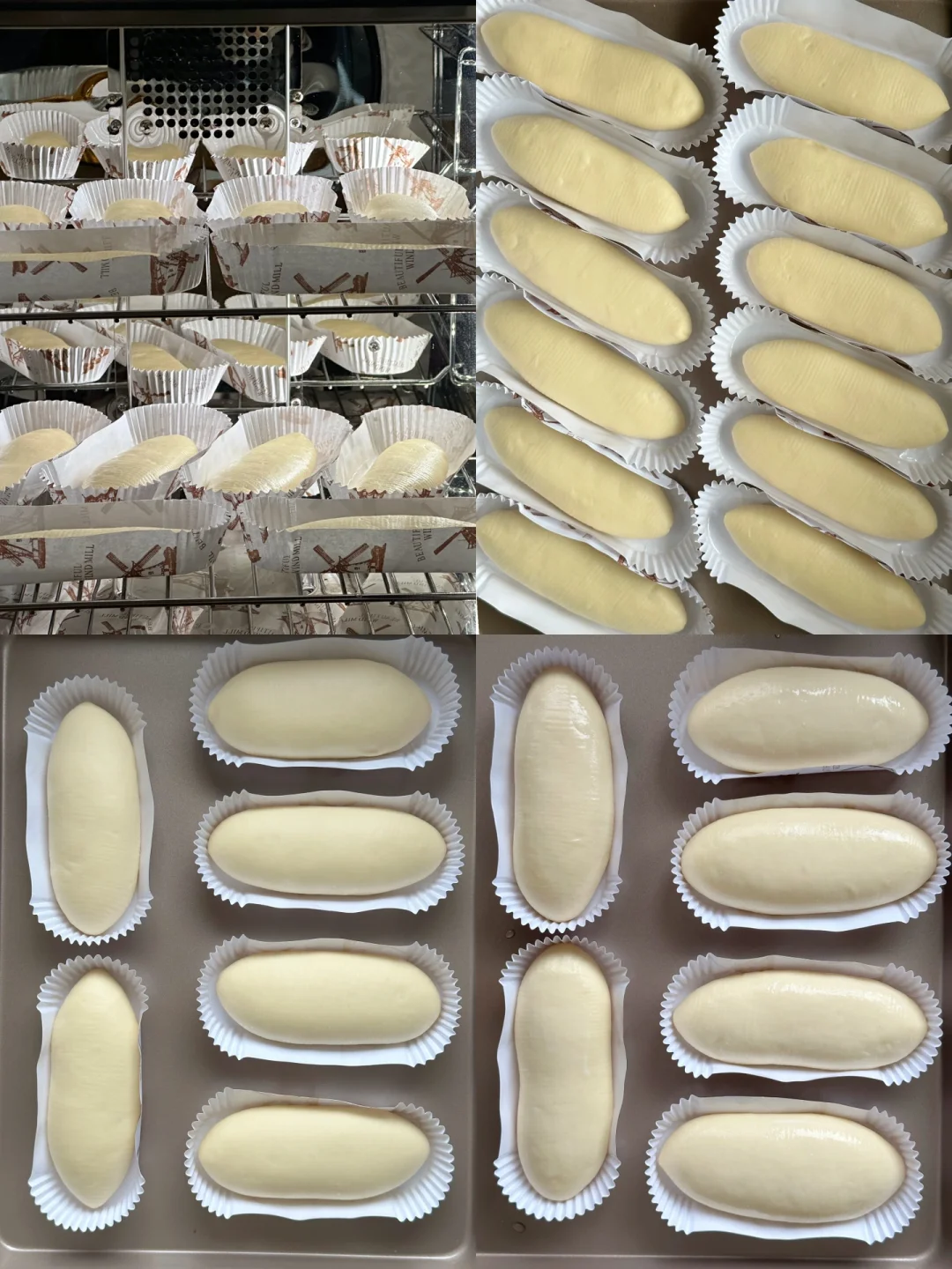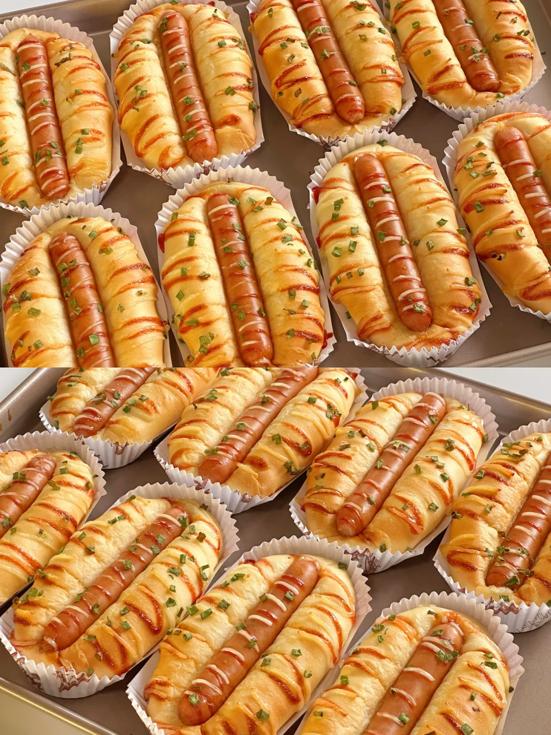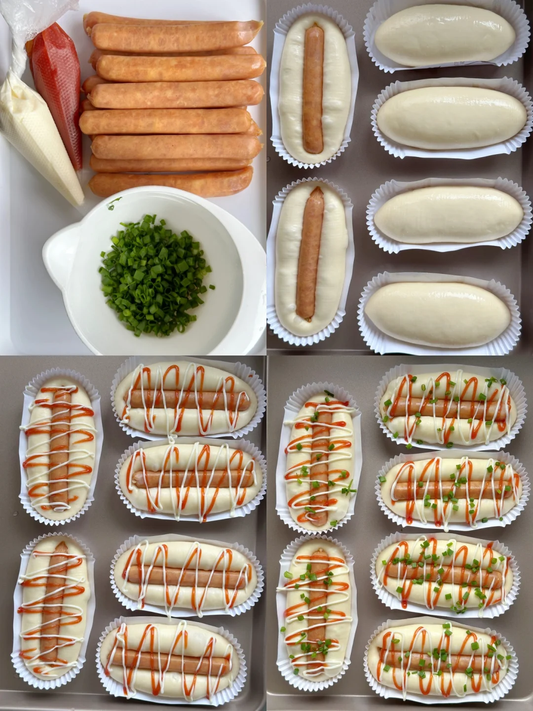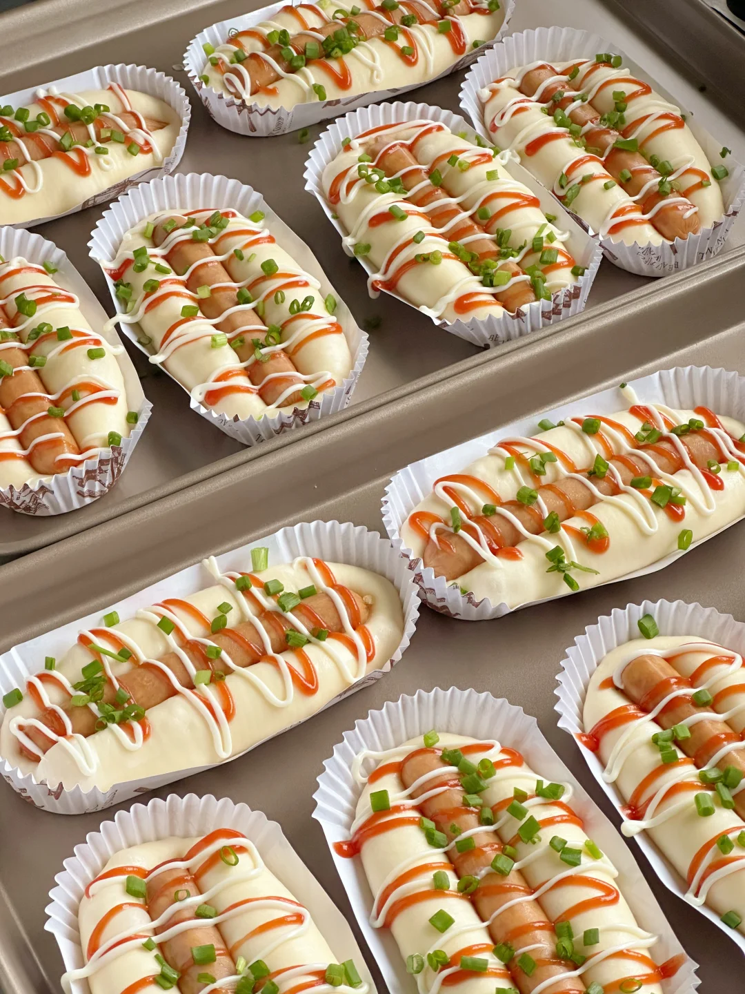 5️⃣依次做好, 放入模具中,在温度32°C左右,湿度80%发酵至2倍大,放入提前解冻好的香肠,挤上沙拉酱、番茄酱,撒上葱花