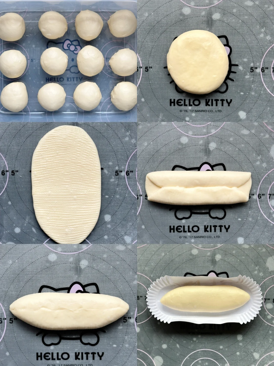 4️⃣取一个松弛好的面团,擀成牛舌状,拍掉边上的气泡,翻面对折捏紧收口,放入纸托。