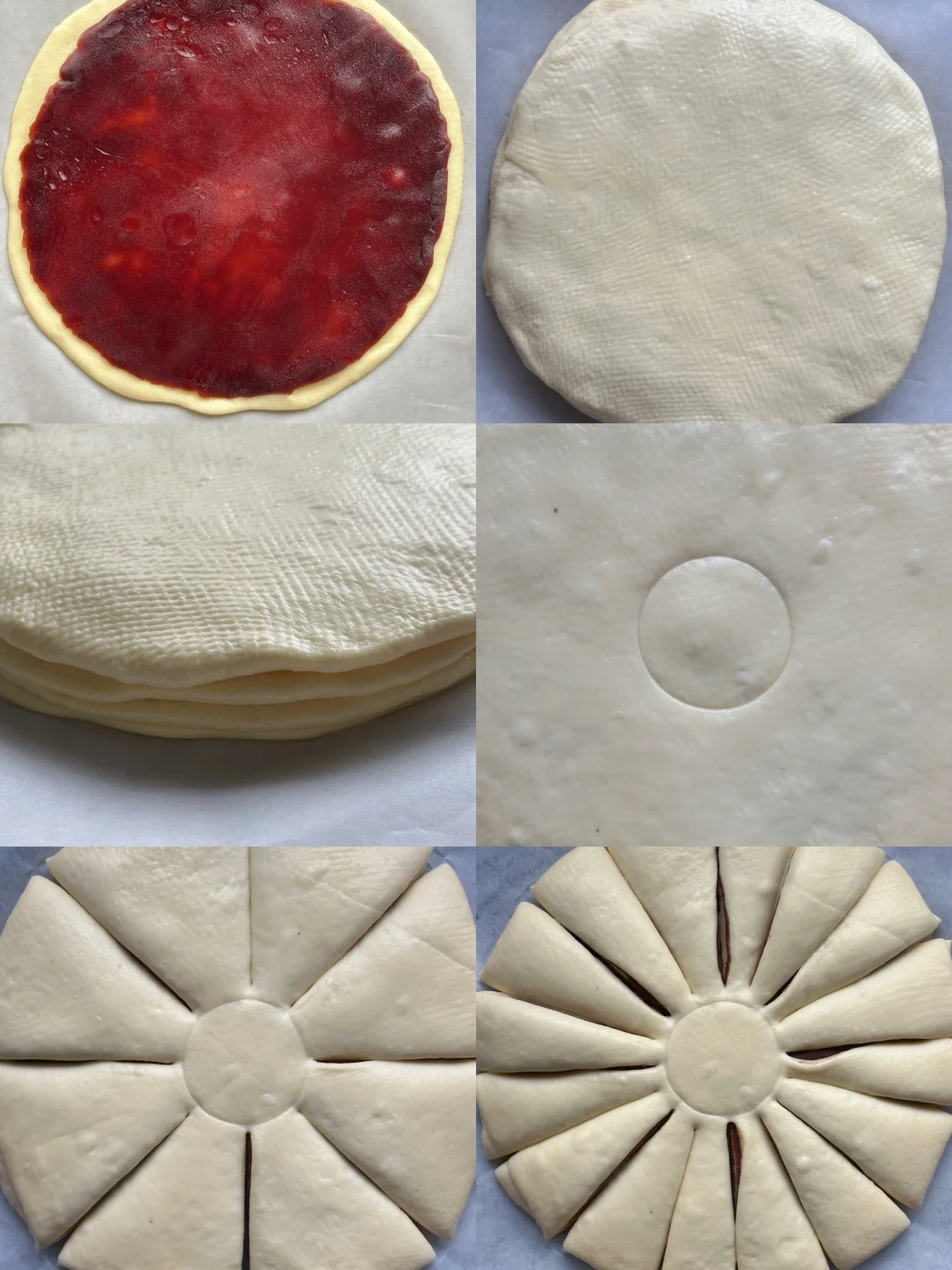 4️⃣然后按圆面片➕豆沙馅➕圆面片➕豆沙馅➕圆面片➕豆沙馅➕圆面片的顺序叠起来